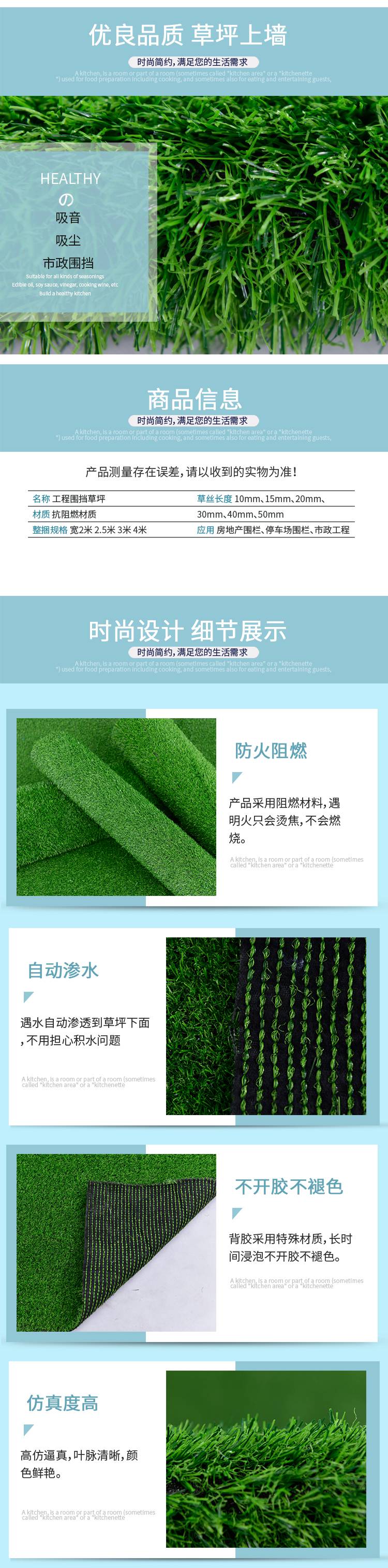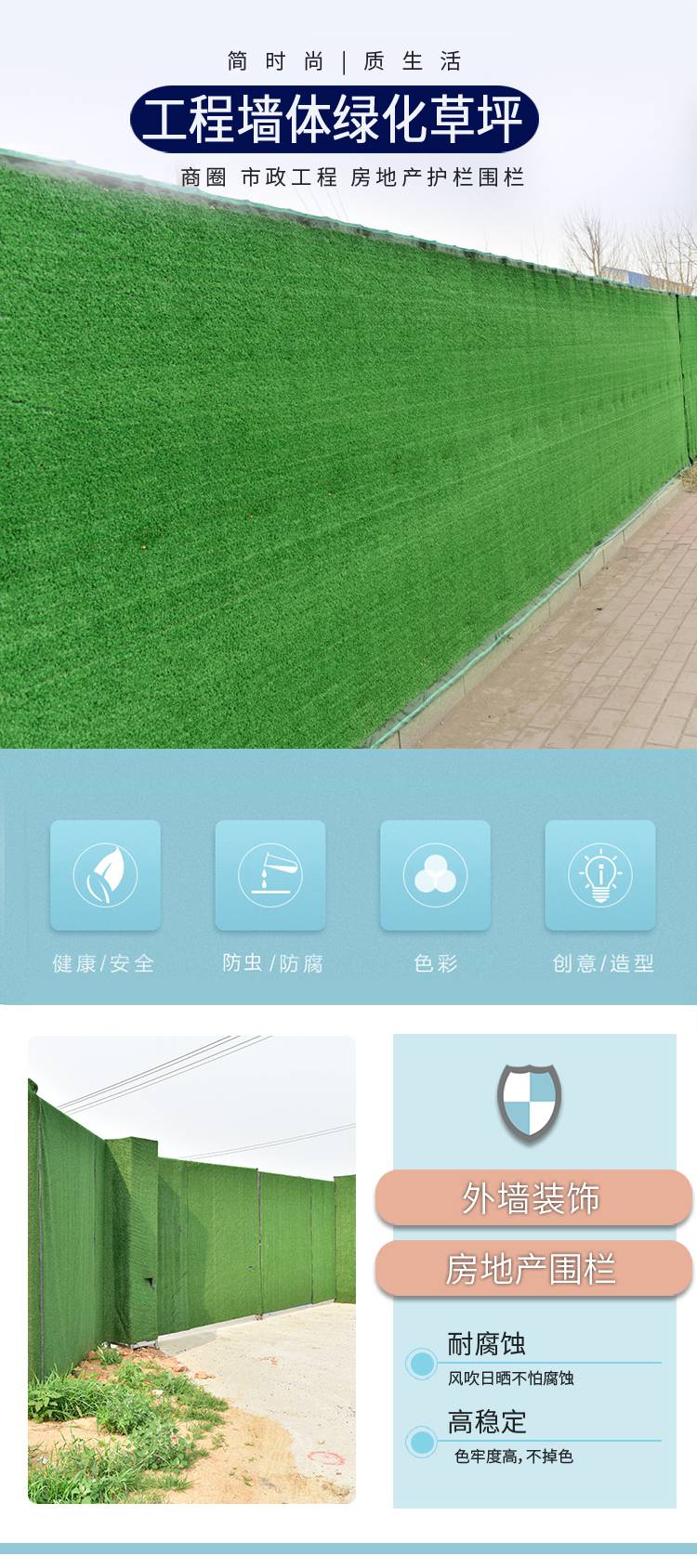 很多时候围挡墙面草坪发生破裂或者是脱丝,主要都是因为其底衬在耐磨性和强度上都不够,在经过了长时间的老化、腐蚀和磨损之后,终出现严重的破裂和脱丝的情况,所以底衬在耐磨性上对于围挡墙面草坪来说,是***质量的重要条件。围挡墙面草坪在颜色上不均匀,导致色差的出现,将不同色号的草丝在加工和生产成草坪之后,铺设到同一块场地上会出现色差的情况;对于草丝在薄厚上应该一致,且颜色还要均匀,这需要***的技术含量。在被阳光照射之后,发生比较明显的褪色的情况,而且褪色出现严重的不均匀,因此在紫外线强烈的照射下,围挡墙面草坪的稳定性和色牢度等,都是对围挡墙面草坪在指标上的重要考量。