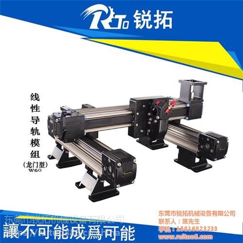 东莞锐拓机械自产自销高精密度同步带直线模组、滑轨滑台,该模组可配置在各种自动化设备上使用,该产品使用方便,安装简单,保养维护起来也比较简单,同时它的价格相对丝杆的导轨更亲民,更适合使用在大批量生产销售的自动化设备上,因为它可以大限度的降低成本,同时又能***运转时的精准备度,不失为一款比较更为实用的产品。