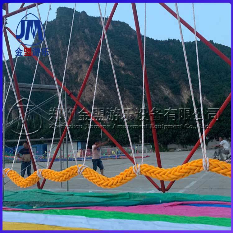 大型多人秋千荡桥,说它是大型的并不代表他就不安全,虽然占地比较大,但是其实游客荡桥荡的高度是很低的,而且下面有安全充气垫保护,起着很重要的保护作用,即使有人不小心摔倒了,也是直接落到气垫上,有很好的缓冲防护作用,不会使人受伤什么的,是安全的,可以放心玩,也很好
