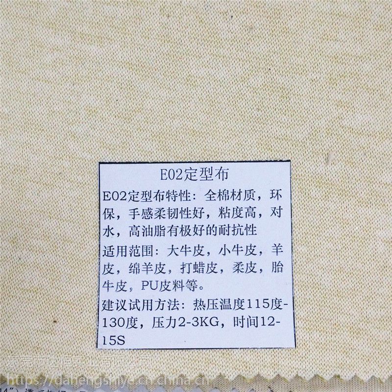 定型布为预先订制品,是将热熔胶涂在纺织品材料上,用于粘结皮制品(如皮鞋,手袋等)无需表面处理就能达到很好粘结效果,保持坚挺定型的内衬产品(克服了皮革由于外表紧内皮松软,用传统上胶贴合造成皮革面皱的缺陷)定型布的使用使皮制产品的档次上了一个台阶,恒达定型布自推广以来,很受鞋厂、手袋厂等客户的欢迎,恒达环保定型布共有A、B、C、E、F、H等几种类型,按使用操作又可以分为热烫型(A、C、E、F类)和冷贴型(B类);A类热烫型定型布主要适用于坚挺、有弧度的产品,B类冷贴型定型布适用于怕高温的皮料,C类热烫型定型布适用于柔软、透气类产品。E、F类主要适用于易出油***定型。
