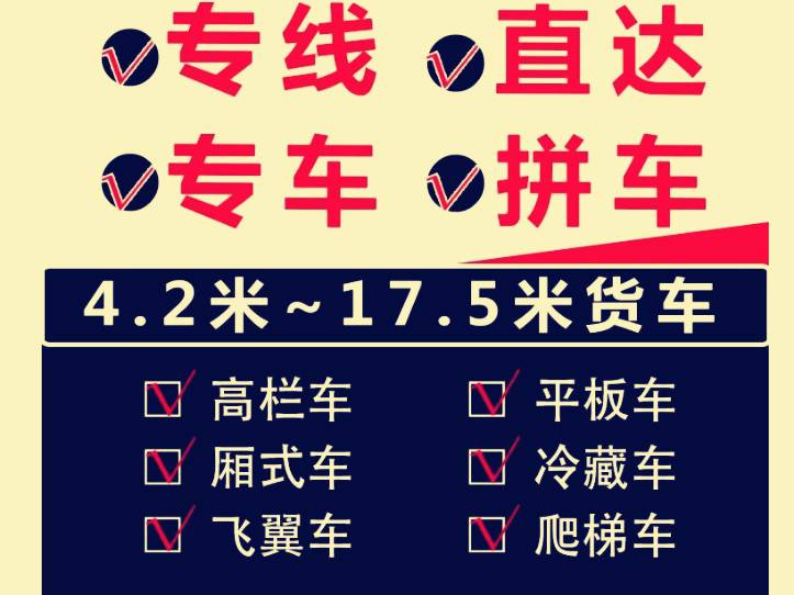 4.2m,6.2m,7.2m,8m,9..6m12.5m,13m,15m,17m,18m全封闭,高护栏,敞车,高低托板,轿车运输专用车,大件运输专用运输车队。运输网络遍布全国,每天往返于全国各地。