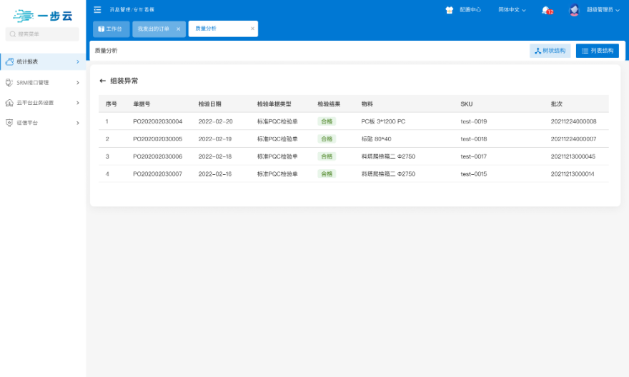 在一步云·数字工厂系统中将质量信息与生产工单相关联,根据企业的质量检验标准进行质量检测,并在系统中记录质检结果,形成质量正反向追溯体系。