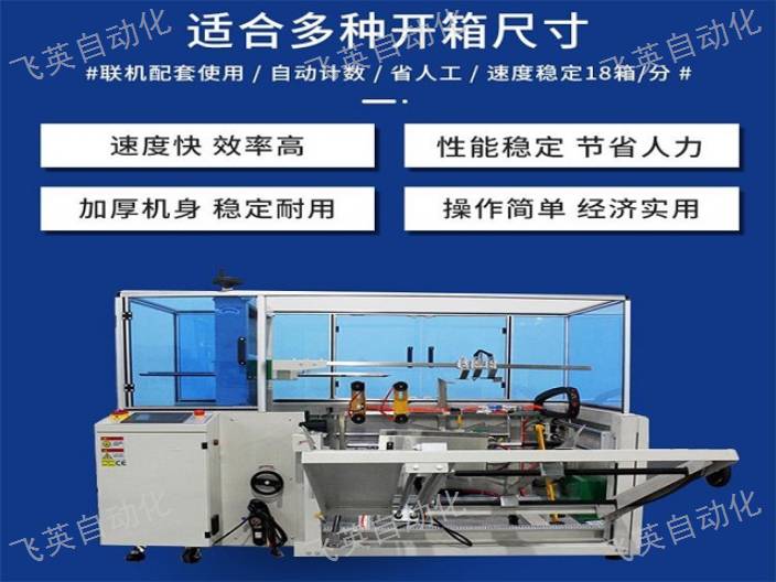 全自动开箱机分为哪几种?开箱机可将纸板自动拉开成型,在底部胶带封口的机器,别名又叫纸箱成型机。箱子底部按一定程序折合,并用胶带密封后输送给装箱机的设备。主要由上箱机构、主机架、真空吸箱、主传动、箱板抬升机构、摇臂输箱机构、开箱机构、调高机构、纸箱短边折边机构、纸箱长边闭合及整型机构、推箱拨叉、纸箱导轨、压实撞杆及热熔胶系统、气动控制系统、电气控制系统等组成。开箱机集自动开箱、自动折合下盖、自动密封纸箱底部,机器采用PLC+人机界面控制,折底不停留,输送中完成折底、封底;同时完成吸箱、成型、折底、封底整个过程;操作方便、维修简单、性能稳定,是自动化规模生产***的流水线设备。按速度可以将开箱机分为:自动开箱机和高速开箱机。飞英自动化设备生产的开箱机设备详情,可以了解下。