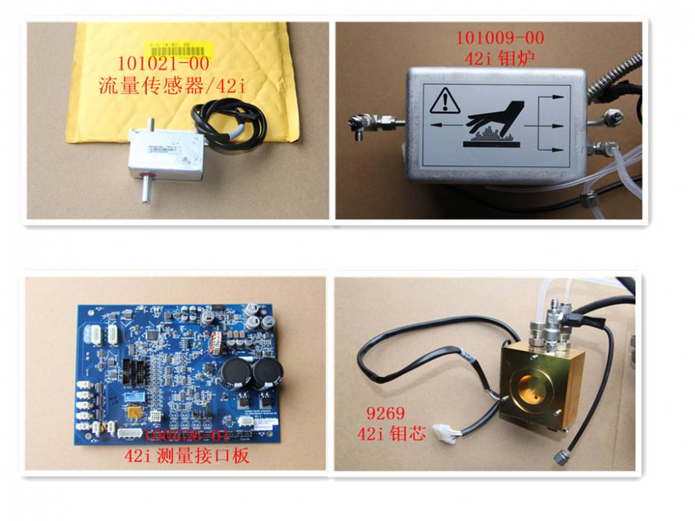 母版、程序板、接口板、数字输出板、24V电源、保险、插头、显示屏、冷却风扇、冷堆、底部插座、光电倍增管、O圈、康宁红滤池、氟橡胶垫片、变压器、温度控制板、反应室、毛细管座、毛细管、光学滤光片、钼炉、O3转换器、钼转炉组件、加热管、(臭氧发生器组件)、臭氧发生器、臭氧发生器变压器、开关型流量计、流量传感器、二氧化硅清除器、聚四氟乙烯保护晶片、泵、泵膜、泵膜安装盘。美国热电42i氮氧分析仪配件、42i配件、氮氧分析仪配件