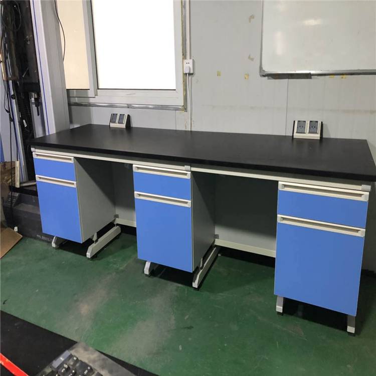 菏泽全钢木实验台详情介绍: 1.1、 台面:采用具有防酸、防碱、耐腐蚀性能的国产12.7mm厚实芯理化板台面。边缘加厚至25.4mm,耐强酸、耐强碱、耐化学溶剂腐蚀性,抗强冲击,不变形,硬度高,不易损坏,经久耐用。 1.2、 主框架、架边、前后梁:采用上海宝钢60mm*40mm*1.2 mm矩形钢管焊接而成,焊点无毛刺、无脱焊、无虚焊、无假焊。表面经酸洗、磷化后做环氧树脂 EOPXY 粉末静电涂喷,满缝焊接而成,连接处一体成型,具有耐腐蚀、防火、防潮等功能,承重性能好,使用寿命长。支架颜色为蓝色,其余为灰白色;3.2.3 底柜托梁:采用上海宝钢30*50*1.2mm矩形钢管焊接而成,表面经环氧树脂 EOPXY 粉末静电涂喷,耐酸耐腐蚀。 1.3、 柜体:采用18mm厚山东林盾E1级双面粘压环保型三聚氢氨板;所有截面采用封边机以2mmPVC封边条封边,粘力强,密封性好,外形美观、经久耐用。所有板件采用三合一连接件,结构稳固,承重性能好且易于拆迁,在实验室酸碱环境长期使用不会生锈腐蚀。 1.4、 门、抽屉面板:采用18mm厚山东林盾E1级双面粘压环保型三聚氢氨板;所有截面采用封边机以2mmPVC封边条封边,粘力强,密封性好,外形美观、经久耐用。 1.5、 背板:采用16mm厚山东林盾E1级双面粘压环保型三聚氢氨板;所有截面采用封边机以1mmPVC封边条封边,粘力强,密封性好,外形美观、经久耐用。后板可灵活拆卸,利于隐藏水电管道的维护修复。