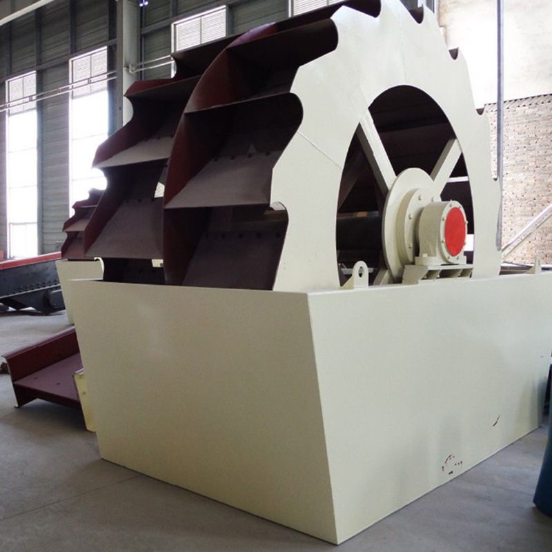 轮式洗砂机工作时, 砂石料被喂入洗砂机中。轮斗在传动的带动下进行,将砂水搅动起来,并将砂石从水中捞出来,轮斗脱离水面之后,轮斗中的砂石被保存在轮斗中,水和砂石中的杂质从轮斗上的筛网中漏出,从而起到了清洗的作用。 在洗砂中,轮斗对水中的砂石不断进行搅动和翻腾,促进了砂石中的杂质与砂石的分离,起到了一 定的清洗作用。