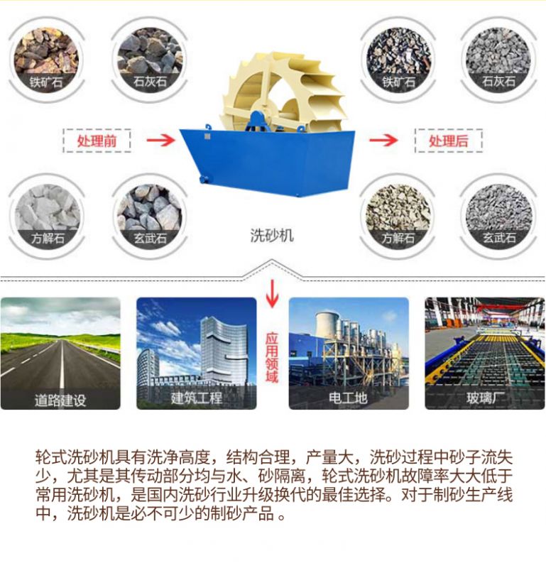 洗砂机广泛应用于建筑工地、砂石厂、水电站混凝土大坝工地等多种行业,它具有洗净度高,结构合理,处理量大,功耗小,洗砂中砂子流失少,尤其是洗砂机传动部分均与水、砂隔离,故其故障率大大低于目前常用洗砂机,是国内洗砂行业升级换代的选择。