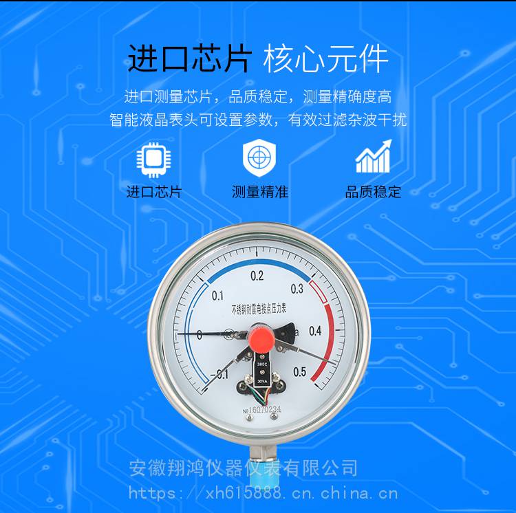 电接点压力表由测量系统、指示系统、磁助电接点装置、外壳、调整装置和接线盒(插头座)等组成。一般电接点压力表是用于测量对铜和铜合金不起腐蚀作用的气体、液体介质的正负压力,不锈钢电接点压力表用于测量对不锈钢不起腐蚀作用的气体、液体介质的正负压力并在压力达到预定值时发出信号,接通控制电路,达到自动控制的报警的目的。