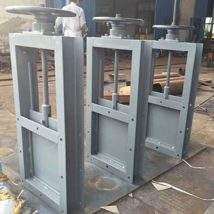 该闸门主要由框架、丝杆螺母、手轮、闸板组成,手轮(链轮)转动,丝杆带动丝杆螺母和闸版作水平方向的往复运动,达到闸门的启闭目。