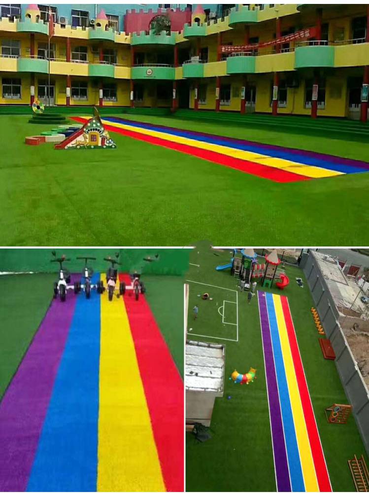 幼儿园草坪25mm高加密系列人造草坪是以仿草叶状的合成纤维,植入在机织的基布,背面涂上起固定作用的涂层以作运动场上、庭园地坪和绿化地面上,原料多为聚乙烯和聚丙烯为主,广泛应用于运动和休闲场所。青岛市博翔远人造草坪在运动及休闲草坪的生产上,运用好的技术设备,较好的思维理念,确保产品多品种、系列化、高质量的发展,不断的在发展过程中完善品种结构,以推动人造草坪、人造草坪市场的良性发展。 幼儿园草坪的施工注意事项 1. 施工时,不可将粘接胶暴露时间过长,因溶剂挥发会造成 粘度过大而无法施工; 2. 如温度过低时,可用热水加温到15-20。C后,即可恢复原 来状态,且性能不变; 3. 按照设计图纸核实基础部分的基准线、图型相对尽寸,发现有误码或者不确定之处,立即停止施工,通知技术部门,放线准确后由技术部门负责人核实后方可施工; 4. 根据场地用途及设计要求,在基础面层上确定标志线,标志线的确定应符合不同体育项目竞赛或练习的要求; 5. 人工草坪全部完工后,再次使用专用设备加填或推均石英沙,使之沉淀,美化人工草坪的整体效果; 不同的幼儿园室外人造草坪用途是不同的,运动草坪可用于足球场、网球场、曲棍球场、门球场、棒球场、板球场、橄榄球场、篮球场、羽毛球场地等;休闲草坪适用于室内装饰,庭院景观及楼宇绿化,草坪颜色鲜绿自然,草丝细密等;幼儿园人造草坪以专用设计、使用成本少、维护保养方便、环保安全、外形美观、适应性强等优势,全面覆盖和替代了传统塑胶和PVC等铺装材料。