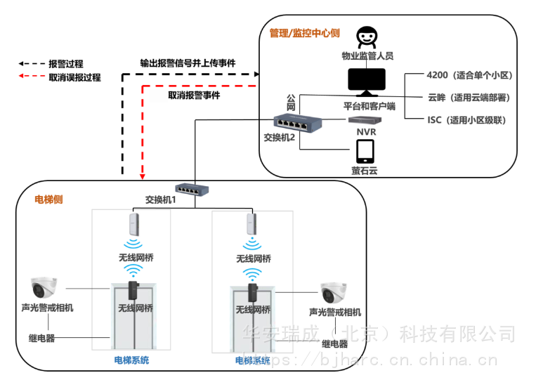 电瓶车推进电梯,电梯就会实时声光提醒: “请勿将电瓶车驶入电梯” 即使进了电梯,楼层按钮也会短暂”失效",无法上楼。 用科技的方法让电动车只能选择去他该去的地方。 其实这套方案说简单在于安装方便,你也可以评价黑科技满满,利用海康威视智能深度学习算法,准确检测,你看,孩子推车老人轮椅都能无阻碍上楼。 更能联动人工复核,远程实时提前预警,提醒干预,让电动车安全物业管理更轻松! 那么怎么实现的呢? 海康威视电动车智能检测方案提供提供两种方案,既可以通过安装声光警戒相机实现,又可以轻松利旧原有相机,通过海康AI开放平台超脑NVR搞定一整个小区。 电梯内电梯厅,单元楼出入口都可以实现。 一.海康威视电动车安全联动梯控智能预警方案