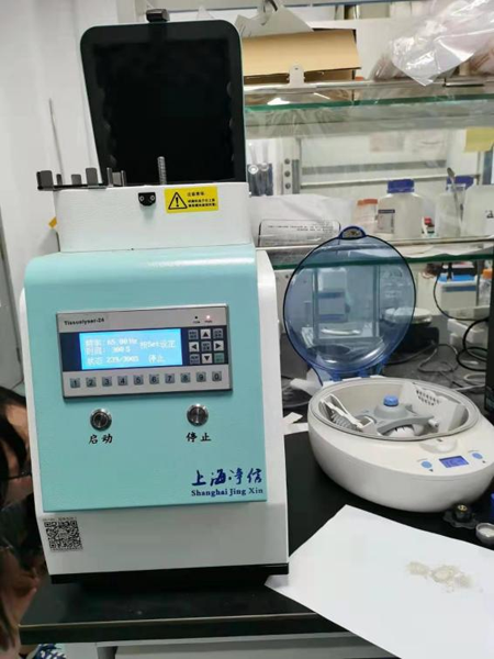 实验选用仪器: 多样品组织研磨仪 Tissuelyser-24L 多样品组织研磨仪Tissuelyser-L是一种特殊的、快速的、高效率的、多试管的一致系统。研磨球在研磨仪内来回高速撞击及摩擦,在非常短的时间内便可完成样品的研磨、粉碎、混合及细胞破壁。在生命科学、医药、生化、环境、地质、农业、林业、质检、成分检测、材料等领域有着广泛的应用。 优点: 采用垂直振荡方式,研磨更充分,稳定性更好 同一组织样本设定相同程序,获得相同的研磨效果 内置程序控制器,可对参数进行设置 在研磨过程中处于全封闭状态,避免交叉污染 典型应用: 塑料、橡胶、皮革、骨头、谷物、陶瓷、化学制品、玻璃、 头发、矿石、榨油用籽、叶片、 淤泥、土壤、药片、织物、组织、废弃物、羊毛、DNA/RNA提取、QuEChERS。 |