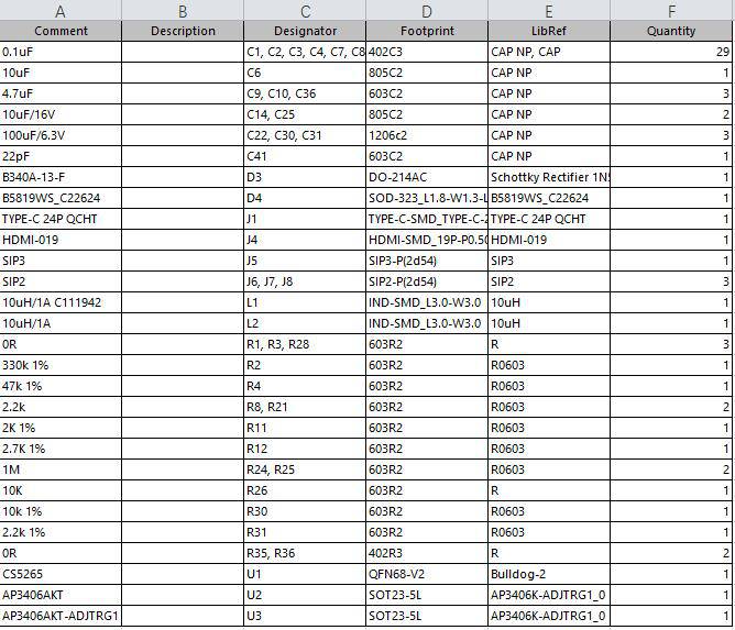 CS5265设计以上Type-C 转HDMI2.0投屏器或者TYPEC转HDMI4K60HZ转换器BOM 元器件单如下: