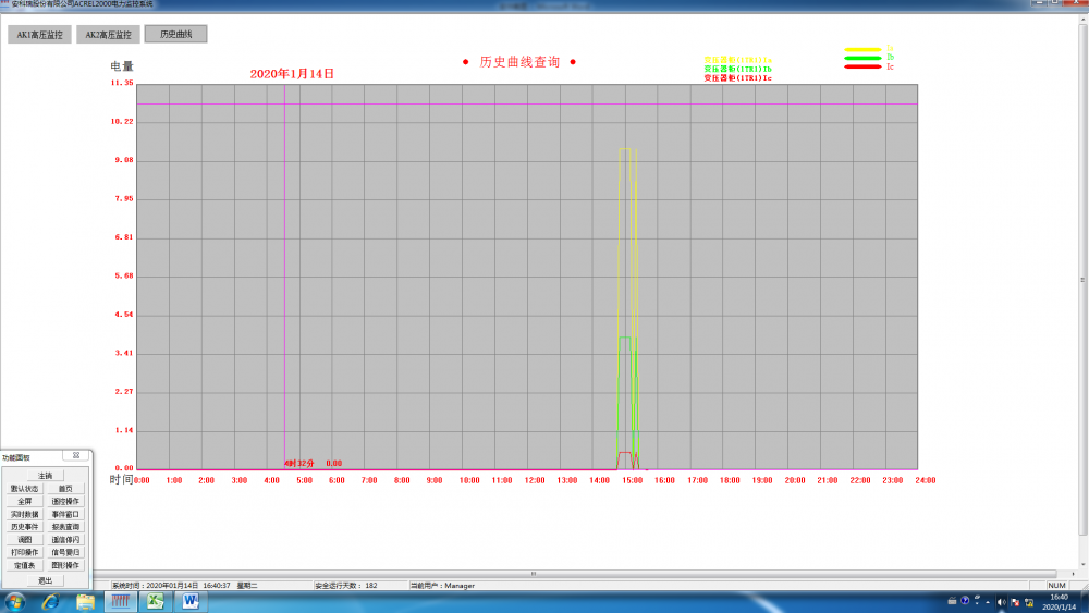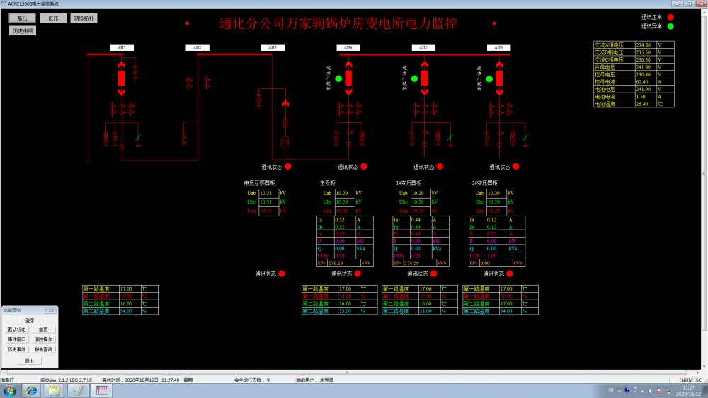 3 系统功能 配电所实时监控系统图为主监控画面,主要实时监测变电所内所有配电回路的运行状态。在系统图中可以直观的看到配电回路的运行参数和状态,如:三相电压、电流、有功功率、无功功率、功率因数、频率等。
