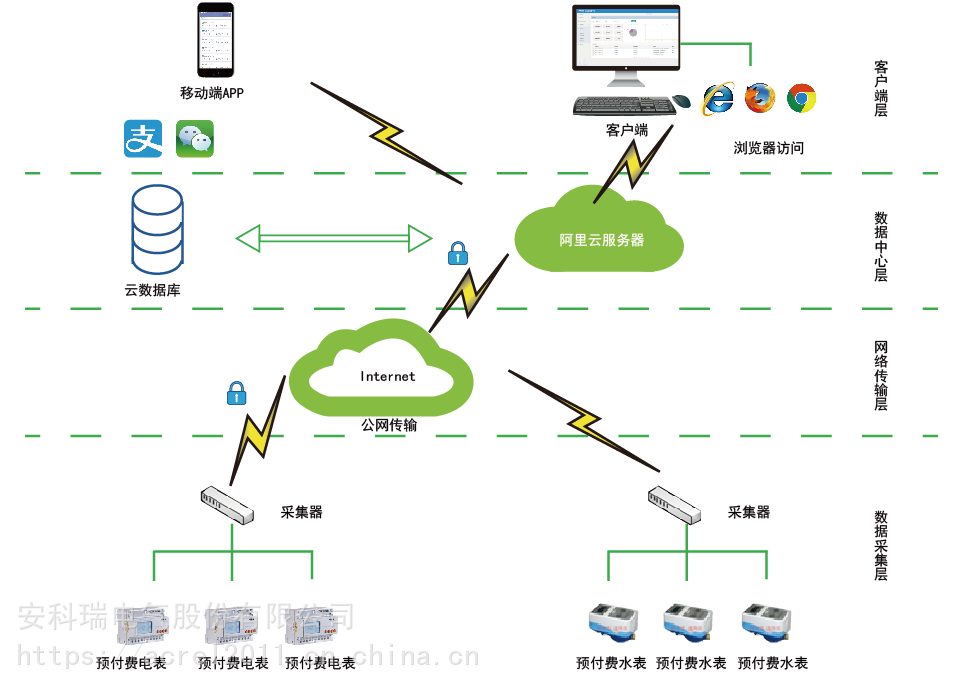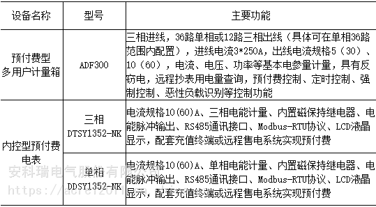 6安科瑞智能电表在远程预付费系统中的应用及介绍 6.1系统简介 系统为B/S架构,主要包括前端管理网站和后台集抄服务,配合公司的预付费电表DDSY1352和DTSY1352系列以及多用户计量箱ADF300L系列,实现电能计量和电费管理等功能。 另外可以选配远传阀控水表组成水电一体预付费系统,达到先交费后用水的目的,剩余水量用完自动关阀。