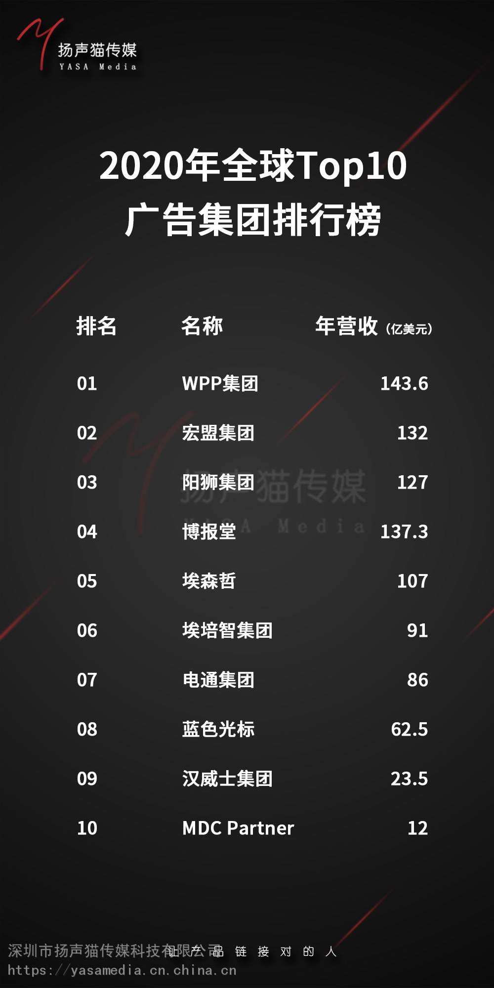 我们是如何排名***的在我们的***广告集团排名中,我们主要从集团营收和行业影响力等方面综合***,其中营收的评分权重占比较高。 企业收入数据来自各集团的2020年公开财报。 以上***榜由扬声猫传媒收集数据并整理评分排名,如有错误欢迎指出。 |