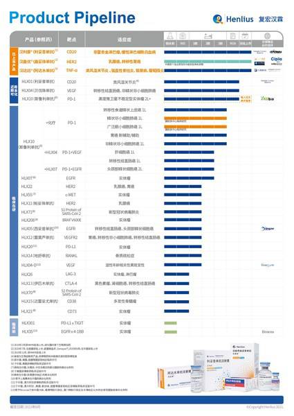 作为***根据国家生物类似药指导原则开发并获批上市的生物类似药,汉利康®(利妥昔单抗)于2019年成功获批上市,全面覆盖原研利妥昔单抗于中国获批的所有适应症,用于非霍奇金淋巴瘤和慢性淋巴细胞白血病的***。汉利康®国内商业化销售由复星医药附属公司江苏复星负责,上市两年以来商业化销售进入全面加速阶段,已累计惠及超过5万名中国患者。该产品具备100mg/10ml、500mg/50ml两种规格,便于患者搭配使用不同规格组合实现灵活用药。汉利康®(100mg/10ml)截至目前已完成中国境内30个省市的医保开通,并于其中28个省市完成正式挂网/备案采购,于七成以上核心医院实现进药,为产品的商业化销售奠定了广泛基础。此外,汉利康®(500mg/50ml)于2021年5月启动上市和供货,截至2021年6月已完成中国境内4个省市的正式挂网/备案采购。 汉曲优®(曲妥珠单抗,欧盟商品名:Zercepac®)为公司抗肿瘤***领域的核心产品,于2020年7月和8月相继获得欧盟委员会(EC)与国家药监局(NMPA)批准上市,用于HER2阳性乳腺癌和胃癌的***。汉曲优®在中国的商业化推广由公司自建商业化团队负责,该团队全面覆盖市场推广、渠道管理、定价及市场准入、国内销售、战略规划五大板块,现已拥有450位专业人士,全力布局并持续渗透中国境内市场。目前,汉曲优®(150mg)已完成中国境内所有省市的招标挂网和医保准入,其在中国新增60mg规格的补充申请(sNDA)已于近期获得NMPA正式批准上市,进一步增强***经济型,为其后续销量的***提供有力基础。此外,2021年新版中国临床肿瘤学会(CSCO)乳腺癌诊疗指南加入生物类似药,汉曲优®亦被纳入2021年新版中国临床肿瘤学会(CSCO)胃癌诊疗指南,标志着汉曲优®获得了***医学指南的认可。随着销售网络和队伍的持续加强,2021下半年汉曲优®在中国境内市场的推广有望加快推动,拟于年内遍及全国约390个城市,覆盖DTP药房/医院近4,500家。 汉曲优®在欧洲、部分中东及北非地区和部分独联体国家的商业推广由商业合作伙伴Accord负责,2021上半年,复宏汉霖持续联合Accord积极推进Zercepac®在海外市场的商业化进程。截至目前,Zercepac®(150mg)已于英国和包括德国、西班牙、法国、意大利、爱尔兰、匈牙利等近20个欧洲国家和地区成功上市。2021年7月,Zercepac®(150mg)的上市申请进一步获得瑞士药品监督管理局批准。2021年4月和6月,Zercepac® 60mg及420mg新规格产品分别获批于欧盟上市销售,有望为当地患者提供更多剂型选择和灵活的组合用药方案。2021年上半年,公司亦同Accord母公司Intas签订正式协议,新增汉曲优®在美国、加拿大地区的商业化布局,全面覆盖欧美主流生物药市场。 汉达远®为公司***用于自身***疾病***的产品,于2020年12月获NMPA批准,可用于治类风湿关节炎、强直性脊柱炎及银屑病的***,其在国内的商业销售由复星医药附属公司江苏万邦负责。2021年4月,汉达远®新增葡萄膜炎适应症的sNDA正式获NMPA批准。截至目前,汉达远®已经成功完成国内27个省市的挂网工作。江苏万邦成立了针对自身***患者的全病程关爱平台“达远之家”,以期实现患者从就诊到康复的全病程管理,下半年将继续围绕汉达远®与“国家皮肤与***疾病临床医学研究中心”合作推出“ASSC强直性脊柱炎规范化诊疗项目”与围绕银屑病适应症与中华医学会皮肤性病学分会的各项巡讲、义诊患教等,共同助力中国强直性脊柱炎的规范化诊疗。汉达远®拟于2021年内覆盖4,000名专科医生、完成约3,000家DTP药房/医院的覆盖,早日在“经济可及”的基础上实现“渠道可及”,力争实现患者“买药不出县”的目标。 02 差异化产品接力冲刺,持续丰富商业化管线 在不断夯实多款已上市产品商业化成果的同时,复宏汉霖就管线中多款产品进行差异化开发,目前公司3款生物药产品皆已获得NMPA上市注册申请受理,有望于2021/2022年获批上市,持续丰富公司商业化管线。 斯鲁利单抗HLX10为复宏汉霖自主研发的创新型抗PD-1单抗,其针对经标准***失败的、不可切除或转移性高度微卫星不稳定型(MSI-H)实体瘤适应症的上市注册申请(NDA)于2021年4月获NMPA受理,并被纳入优先审评审批程序,有望于2022年上半年获批上市,成为国内******MSI-H实体瘤的抗PD-1单抗。MSI-H实体瘤依据特定的MSI-H肿瘤标志物进行筛查,不以癌种进行区分,因此覆盖患者群体广泛。复宏汉霖采取了“Combo+Global”(联合***+国际化)的差异化开发战略,就斯鲁利单抗相继获得中国、美国、欧盟等国家/地区的临床试验批准,围绕该产品的多项肿瘤***疗法在全球多个国家和地区同步开展临床试验,全面覆盖鳞状非小细胞肺癌、非鳞状非小细胞肺癌、广泛期小细胞肺癌、转移性结直肠癌、食管鳞癌、胃癌、肝细胞癌、头颈部鳞状细胞癌等全球及中国高发瘤种。2021年1月和3月,斯鲁利单抗联合贝伐珠单抗HLX04针对晚期肝细胞癌(HCC)的II期临床研究和******转移性结直肠癌(mCRC)的II/III期临床研究已分别完成受试者招募入组和首例患者给药。截至目前,斯鲁利单抗已于中国、土耳其、波兰、乌克兰、俄罗斯等国家和地区累计入组约2,300名受试者,成为国际临床数据较多的PD-1产品之一。同时,斯鲁利单抗联合化疗(卡铂-白蛋白紫杉醇)******局部晚期或转移性鳞状非小细胞肺癌(sqNSCLC)的全球多中心III期临床试验已完成受试者招募入组,复宏汉霖计划于2021年下半年就该适应症向NMPA递交NDA。 贝伐珠单抗HLX04为复宏