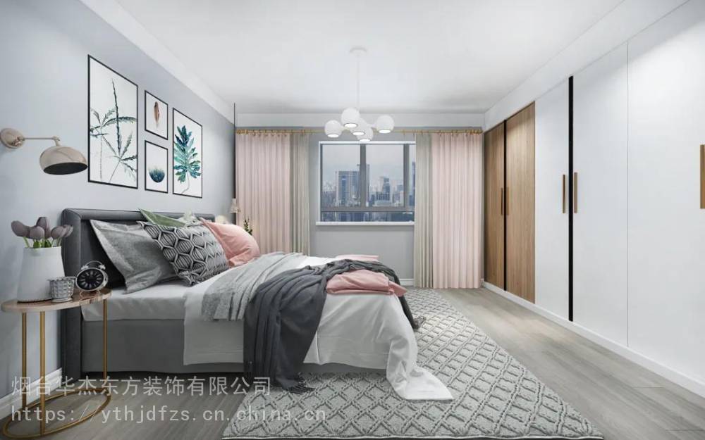△ 主卧床头背景墙采用与电视墙同样的低饱和度颜色,搭配几幅简约淡雅的装饰画,另一侧墙面做了纯白色和原木色的嵌入式衣柜,实现了强大的收纳功能。 灰色调强化地板,搭配灰色纹路的地毯,给整体设计增添了质感。