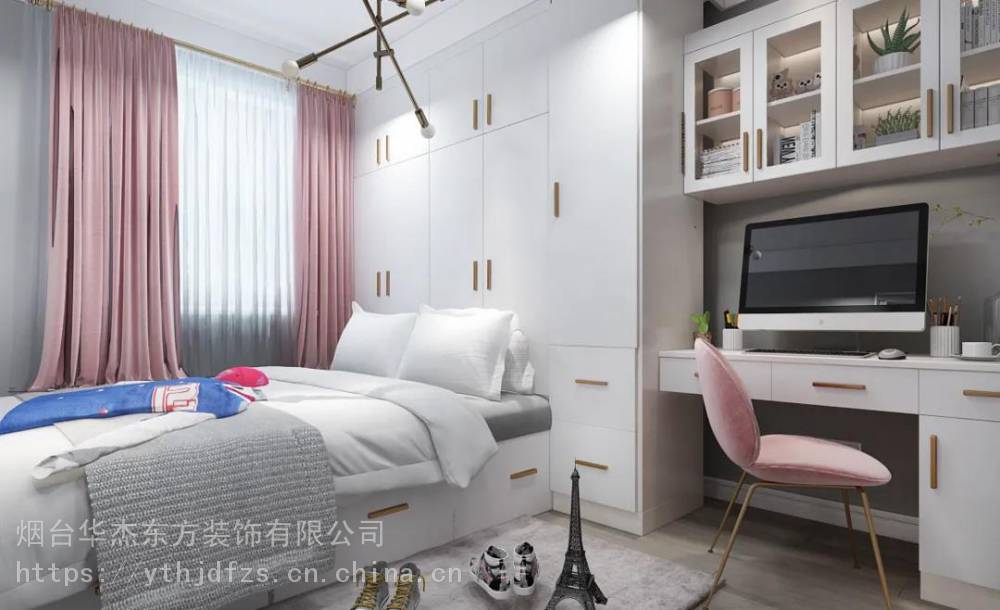 △ 洗手台外移,不仅可以释放内部空间,还可以实现干湿分离,更可以满足多人同时使用卫生间的需求。 大理石纹路的洗手盆下侧原木色悬空浴室柜,左侧定制原木色+黑色边框的格架,尽显北欧风的格调。 卧室 Bedroom