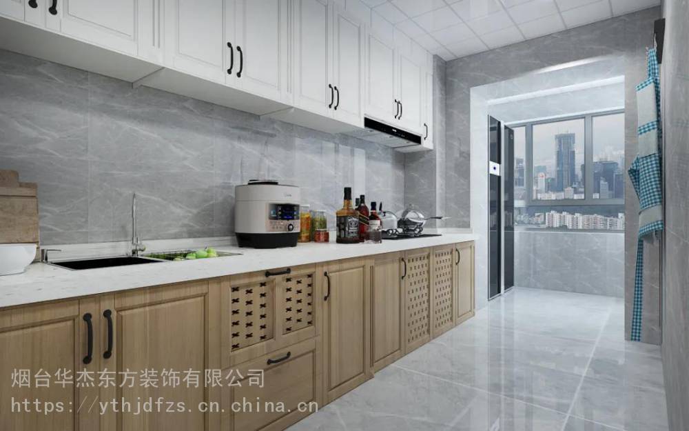 △ 厨房定制白色简约线条的吊柜,为了避免厨房枯燥单调,选择了原木色的地柜,给厨房增添色彩元素,同时充分利用空间,实现厨房的强大收纳功能。 |