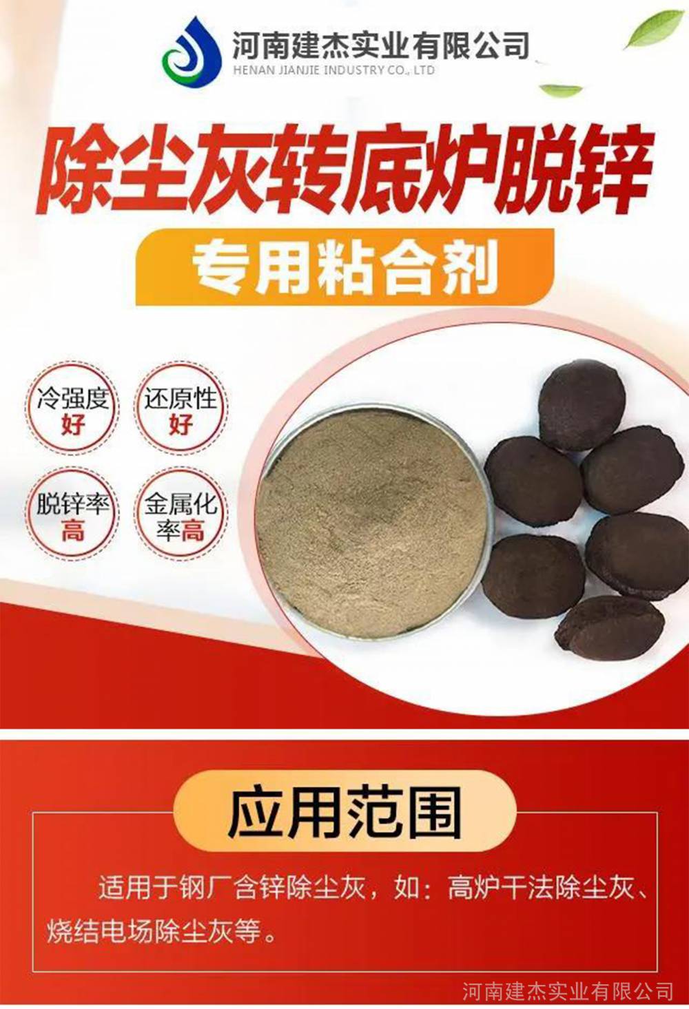 “建杰”牌转底炉脱锌除尘灰专用粘合剂由高分子环保材料制成,具有加量少、灰分小、粘接力强、成型***、强度高,球团不崩解、高温下不粉化,制备的球团耐高温、还原性好、脱锌***、金属化***。 应用范围:适用于钢厂含锌除尘灰,如高炉干法除尘灰、烧结电场除尘灰等。 产品特点: 1. 专业性强:专用于钢厂含锌除尘灰,具有高粘性,球团成型***,冷热强度高,还原性好、脱锌***、金属化***,金属化球团能满足回高炉炼铁要求,避免锌的循环富集引起炉内结馏、风口起翘等造成炉顶温度升高的现象。 2. 抗氧化钙:可以与含锌除尘灰中含的氧化钙结合,使成型的球团能抵抗残存的氧化钙引起的龟裂、崩解、粉化现象,湿强度、冷强度加强。 3. 使用效果好:每吨生产钢厂含锌除尘灰球团25-50吨,成型率98 %,干后冷强度80kg以上,无龟裂、崩解、粉化现象,球团还原性好,脱锌率97%,金属化率80%。 4. 降成本:添加量小,粘结力强,冷压成型,工艺简单,设备投资少,降低生产成本。 5. 使用方便:将含锌除尘灰、与粘合剂按比例混匀后,加水搅匀后冷压成型即可. |