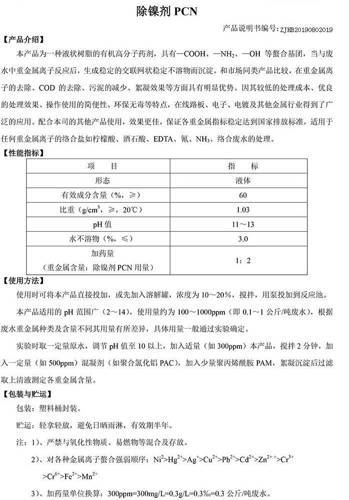 展开 袋装除镍剂 液体退镍剂 去除镍离子【产品介绍】 本产品为一种液状树脂的有机高分子药剂,具有一COOH、-NH2、- OH 等螯合基团,当与废水中重金属离子反应后,生成稳定的交联网状稳定不溶物而沉淀。和市场同类产品比较,在重金属离子的去除、COD 的去除、污泥的减少、絮凝效果等方面具有明显优势。因其较低的处理成本、优良的处理效果、操作使用的简便性、环保***等特点,在线路板、电子、电镀及其他金属行业得到了***的应用。配合本司的其他产品使用,效果更佳,***各重金属指标稳定达到国家排放标准,适用于任何重金属离子的络合盐如柠檬酸、酒石酸、EDTA、 氰、NH3、络合废水的处理。