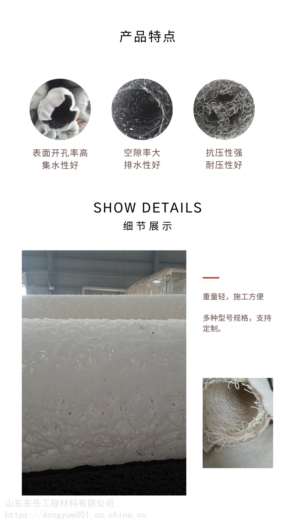 山东东岳工程材料有限公司主要从事:覆膜型膨润土防水毯、钠基膨润土防水毯、土工格室、塑料编织土工布、沙井袋、针刺无纺土工布、土工膜、三维复合排水网、排水板、蓄排水板、塑料盲沟价格、软式透水管、三维植被网、植草格等土工材料的生产与销售。 详询请致电。