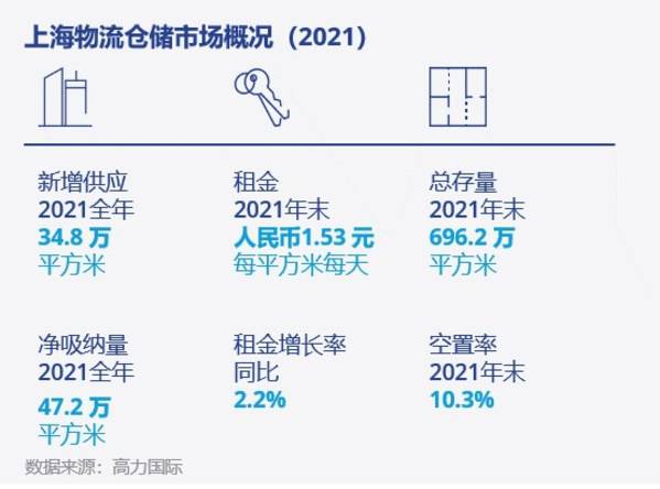 物流 得益于严格的疫情把控和强劲的经济回暖,2021年上海高标仓租赁需求相当旺盛,全市净吸纳量达到47.2万平方米。2021年共入市4个新项目,总建筑面积为34.8万平方米,较2020年降低20%。 2021年上海全市高标仓平均租金为人民币1.53元/平方米/天,较2020年上涨了2.2%。 电商高速发展、第三方物流兴起和传统零售变革催生了旺盛的租赁需求,2021年全市空置率为10.3%,较2020年下降2.4%。