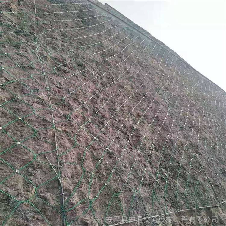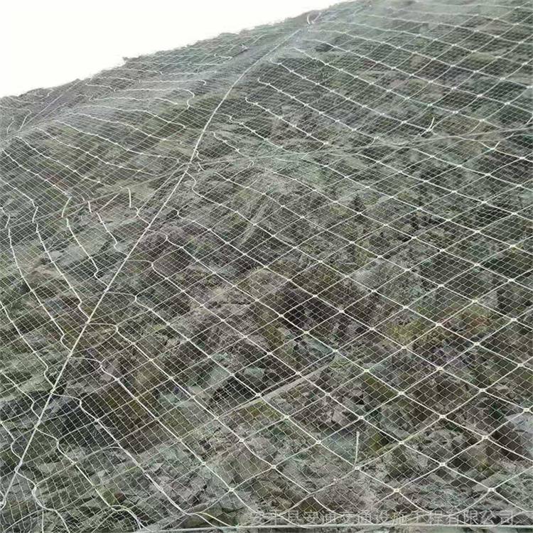 边坡防护网分类有主动防护与被动防护。边坡防护网在高速公路铁路滑坡中的使用。 边坡防护网有主动防护与被动防护,主动防护系统是以钢丝绳网为主的各类柔性网覆盖包裹在所需防护斜坡或岩石上,以限制坡面岩石土体的风化剥落或破坏以及为岩崩塌(加固作用),或将落石控制于一定范围内运动(围护作用)。被动防护是由钢丝绳网、环形网、(需拦截小块落石时附加一层铁丝格栅)、固定系统(锚杆、拉锚绳、基座和支撑绳)减压环和钢柱四个主要部分构成。钢柱和钢丝绳网连接组合构成一个整体,对所防护的区域形成面防护,从而阻止崩塌岩石土体的下坠,起到边坡防护作用。