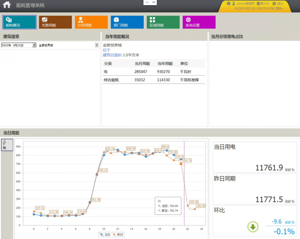 当日电用能曲线 反映建筑物当年用能各分类能耗和折算为标准煤的综合能耗,并计算得到单位面积能耗; 通过表计计量的主要为电能消耗,界面下方显示电能的当日逐时用能曲线;单击每个分类能耗的上部区域,可跳转到该分类能耗的用能分析主界面; 可通过下拉框切换建筑物,建筑物图片可根据项目要求替换; ?分类能耗主界面 反映某分类能耗(例如电)当日及昨日同期、当月及上月同期、当年及上年同期的用能及对比,增长***比及增加值; 反映某分类能耗过去48小时、过去31天、过去12个月、过去3年的用能趋势; 反映某分项能耗的当月用能饼图; 反映某分类能耗当年各月用能同比分析图; ?分类能耗支路用能统计报表 支路用能报表 可灵活选择支路,并统计某段时间内支路用能的日、月、周、季、年用能; 通过透视表功能强大,用户可进行多种数据统计,并对数据进行组合***; 统计数据可通过柱状图、点线图、堆积图、饼图等多种图表展示; 统计数据可导出至Excel; ?分类能耗支路非工作日用能 统计对各支路工作日和非工作日用能,非工作日可通过系统灵活设置 统计数据可导出至Excel; ?分类能耗支路同比分析 统计各支路当年每月用能及去年同期用能; ?分类能耗支路用能集抄 查询各支路任意两个时间的表计读数,并计算出差值; 时间精度到分钟; ?分类能耗支路分时段用能趋势分析 可查询任一支路某段时间内的用能参数(例如电压、电流、功率、功率因数等),具体可查询的参数与安装的仪表和系统配置有关,查询时不可跨月; 数据以图表或表格的形式显示,图表可通过鼠标操作放大、缩小、移动;可对数据进行***(值、***小值); 数据可导出至Excel; ?配置选项 依照相关技术规范配置建筑物的基本信息,例如:建筑功能、建筑面积、空调面积、建筑地址等,其中建筑面积等信息将用能单位面积能耗分析; 配置项目中使用的仪表的类型、型号、生产厂家等基本信息,并添加该型仪表所能提供的监测参数信息,此处配置情况影响能耗统计、分时段用能统计、参数查询功能; 配置项目中使用到的所有计量仪表,保存计量仪表的地址、变比、对应的采集器、代码、监测回路的名称等信息; 配置分项能耗统计时涉及到的计量表计、所占比例、运算方式等信息,可根据项目情况灵活配置,此处配置信息将影响各分类能耗分项用能分析小模块中的功能; 配置各部门用能对应的计量仪表、运算方式、所占比例以及部门用能计划,完成此项配置后将启用部门能耗分析功能模块; 配置建筑物中某用能区域对应的计量仪表、运算方式、所占比例,完成此项配置后将启用区域能耗分析功能模块 ?配电系统实时监控