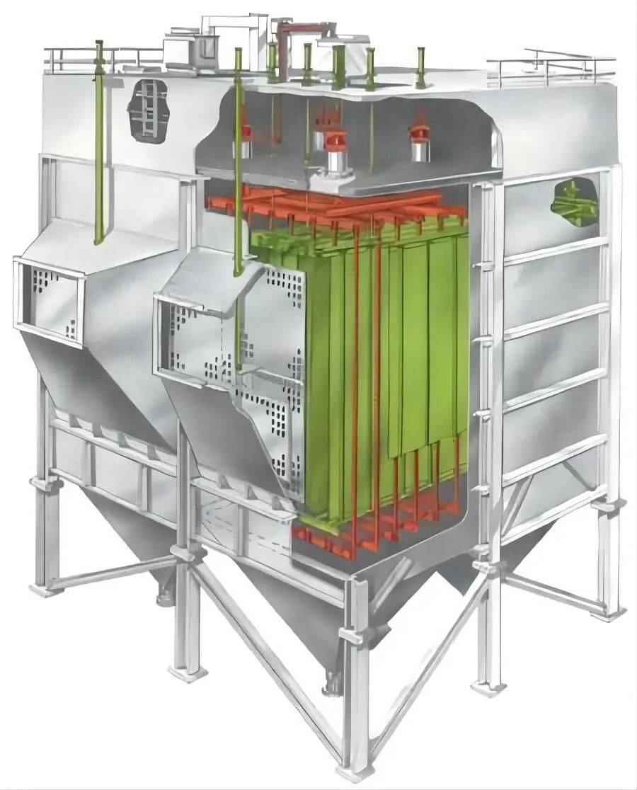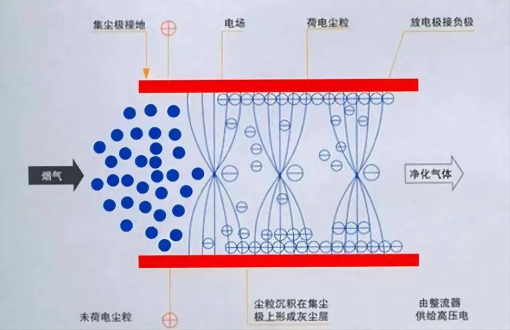 电除尘器的除尘过程分为四步: 1、气体电离 在放电电极与集尘电极之间加上直流的高电压,在电晕极附近形成强电场,并发生电晕放电,电晕区内空气电离,产生大量的负离子和正离子。 2、粉尘荷电 在放电电极附近的电晕区内,正离子立即被电晕极表面吸引而失去电荷;自由电子和负离子则因受电场力的驱使和扩散作用,向集尘电极移动,于是在两级之间的绝大部分空间内部都存在着自由电子和负离子,含尘气流通过这部分空间时,粉尘与自由电子、负离子碰撞而结合在一起,实现了粉尘荷电。 3、粉尘沉积 在电场库仑力的作用下,荷电粉尘被驱往集尘电极,经过一定时间后,到达集尘电极表面,放出所带电荷而沉积在表面上,逐渐形成一粉尘薄层。 4、清灰 当集尘电极表面上粉尘沉积到一定厚度时,要用机械振打等方法将沉积的粉尘清除,隔一定的时间也需要进行清灰。