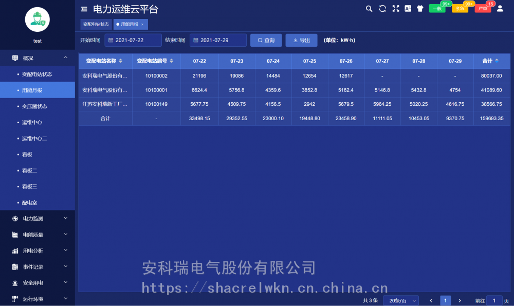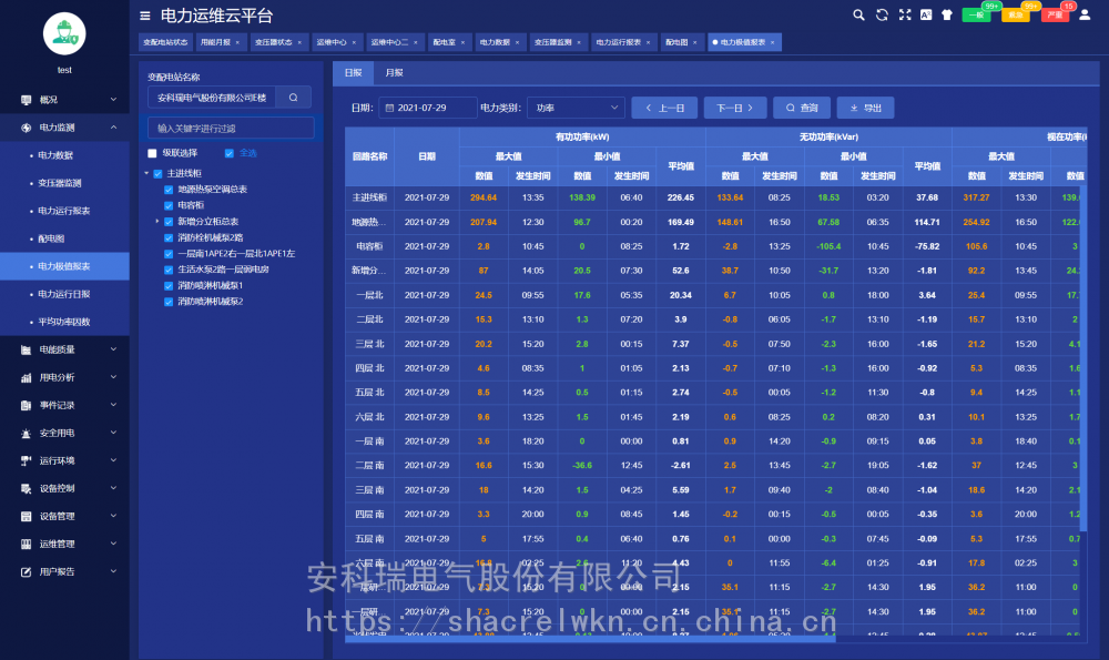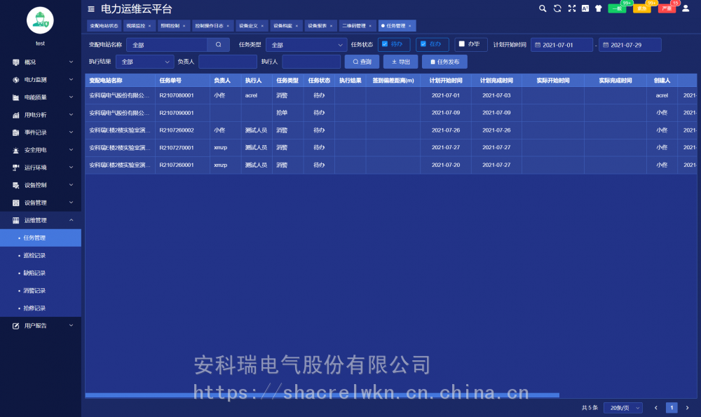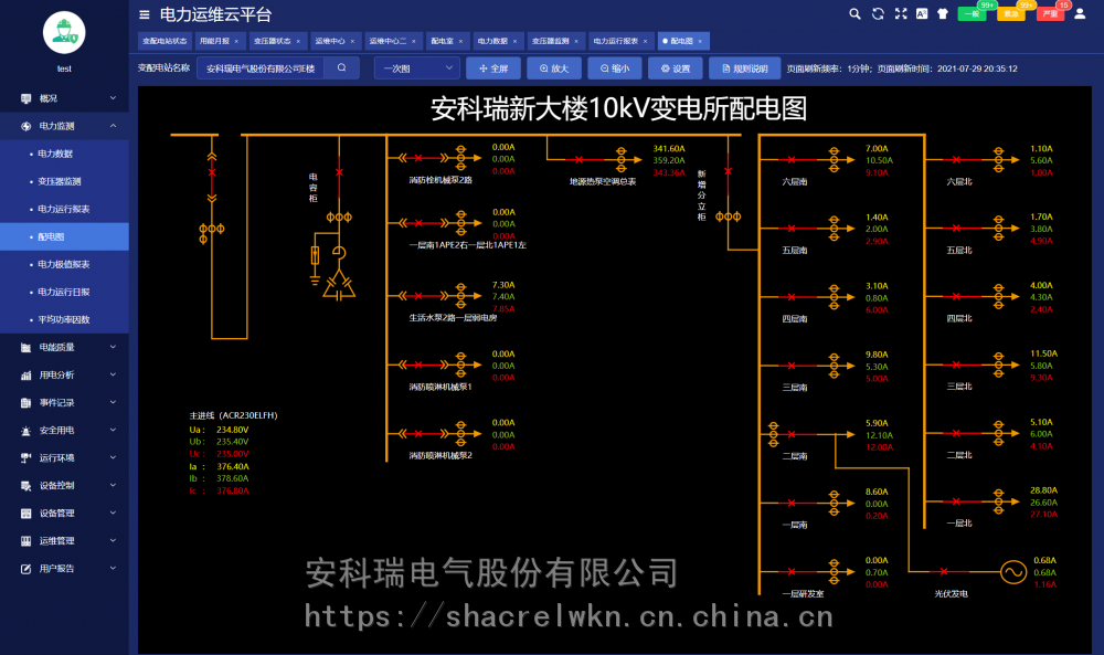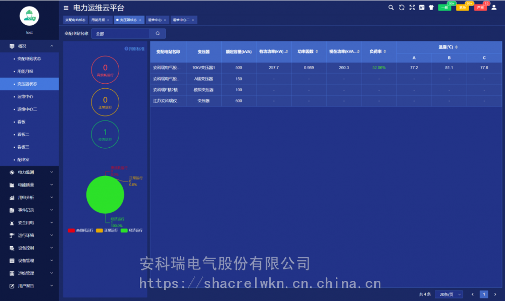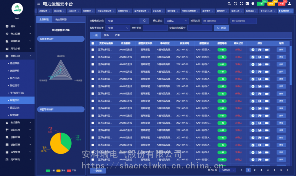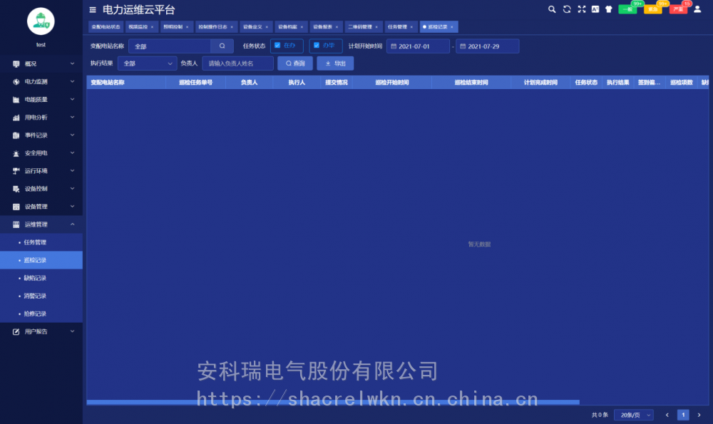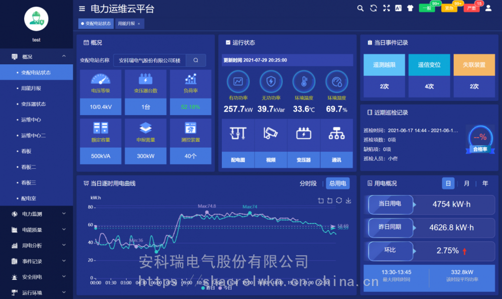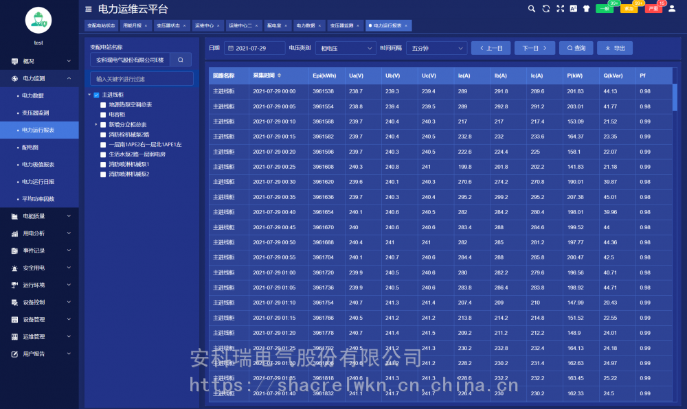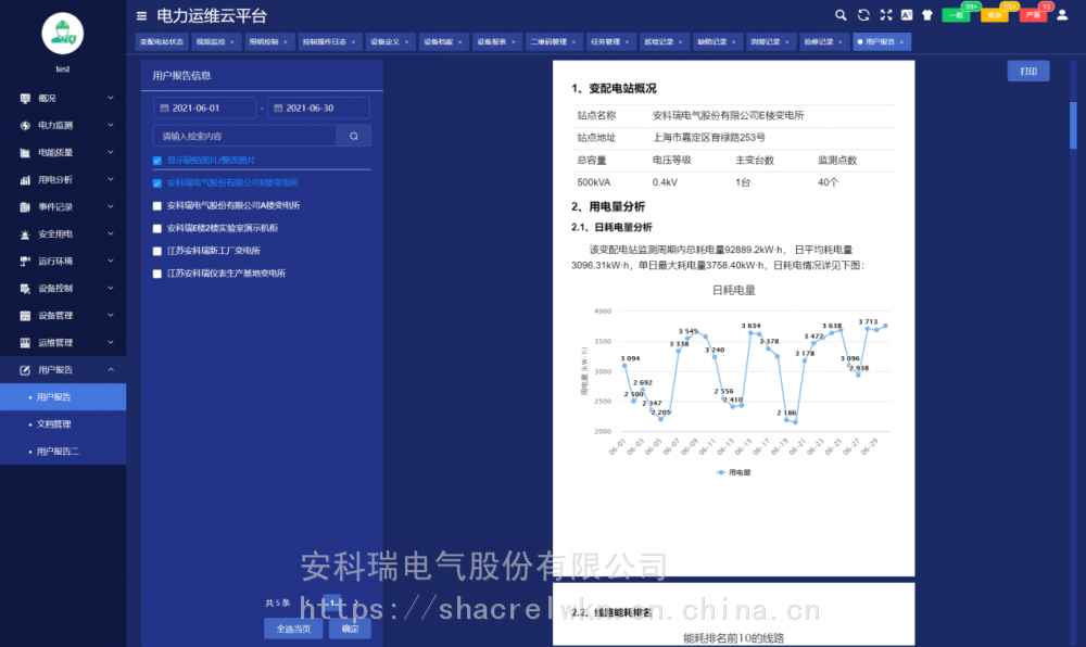 变配电室装设一套智能网关,采集变电室智能设备的数据,经过协议转换、压缩加密后定时上传或触发式上传平台,平台可完成对变配电室内所有智能设备完成数据交换,能实时监测变电站内变压器、断路器等重要运行设备的运行状态;实时监测变配电室内各回路的运行数据及环境温度等数字量;通讯管理单元与厂内局域网连接,把数据传至数据中心。 系统可分为三层:即现场设备层、网络通讯层和平台管理层。 现场设备层:包含变电所安装的多功能仪表、温湿度监测装置、摄像头、开关量采集装置等。除摄像头外,其它设备通过RS485总线接入现场智能网关RS485端口。 网络通讯层:包含现场智能网关和交换机等设备。智能网关主动采集现场设备层设备的数据,并可进行规约转换,数据存储,并通过交换机把数据上传至***的服务器端口,网络故障时数据可存储在本地,待网络恢复时从中断的位置继续上传数据,***服务器端数据不丢失。 平台管理层:包含应用服务器和数据库服务器,若变电所数量小于30个则应用服务器和数据库服务器可以合一配置。服务器需要具备固定IP地址,以接收各智能网关主动传送过来的数据。 4 核心功能 4.1用能月报 用能月报支持用户按总用电量、变电站名称、变电站编号等查询所管理站所的用电量,查询跨度为月。 4.2 变电站状态 变电站状态包括概况、运行状态、当日事件记录、当日逐时用电曲线、用电概况。 4.3 变压器状态 变压器状态支持用户查询所有或某个站所的变压器功率、负荷率、等运行状态数据,支持按负荷率、功率等升、降序排名。 4.4 运维中心 运维中心展示当前用户管理的有关变电所在地图上位置及总量信息。 4.5 配电图 配电图展示被选中的变电所的配电信息,配电图显示各回路的开关状态、电流等运行状态及信息,支持电压、电流、功率、极值等详细运行参数查询。 4.6 电力运行报表 电力运行报表显示选定站所选定设备各回路***采集间隔运行参数和电能抄表的实时值及值、最小值、平均值行统计。 4.7 电力极值报表 电力极值报表按日、月监测各回路重要运行参数,对电压、电流、功率、电压、电流不平衡度、谐波畸变率各次谐波含有率等重要参数等进行、最小及发生时刻、平均值统计查询。 4.8 报警信息 对平台所有报警信息进行分析。 4.9 任务管理 任务管理页面可以发布巡检或消缺任务,查看巡检或消缺任务的状态和完成情况,可以点击查看任务查看具体的巡检信息。 4.10 巡检记录 巡检记录显示了巡检任务的完成情况,以及巡检详情。 4.11 用户报告 用户报告页面主要用于对选定的变配电站自动汇总一个月的运行数据,对变压器负荷、配电回路用电量、功率因数、报警事件等进行统计分析,并列出在该周期内巡检时发现的各类缺陷及处理情况。