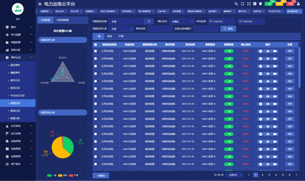 尤兵兵 安科瑞电气股份有限公司 上海嘉定 摘 要:随着***改革政策的逐步推进和落实,电力行业及其衍生的电力运维行业的关注度越来越高,而传统的电力系统维护方式已渐渐不能跟上时代的脚步,市场正在不断地发展扩大。我司AcrelCloud-1000电力运维云平台通过信息化手段,结合大数据技术和专业电力知识,为运维公司、售配电公司、医院和学校等行业提供完善的电力监控与管理方案。该平台基于B/S架构,有配套使用的App应用。云平台实时监视用户配电系统的运行状态和电量数据,通过经验丰富的运维团队和成熟的技术来为用户提供更好的运维服务。云平台提供用户概况、电力数据监测、电能质量分析、用电分析、日/月/年用能数据报表、异常事件报警和记录、运行环境监测、运维派单等功能并支持多平台、多终端数据访问。 关键词:电力运维;运维平台;用电分析;环境监测;多端访问;事件报警 1 引言 新电改要求是“三放开一独立三强化”:输配以外的经营性电价放开、售电业务放开、配电业务放开、公益性和调节性以外的发供电计划放开,交易平台独立。本次电改将有利于还原电力的商品属性,实现电力交易市场化,从而激发电力企业的市场活力,重塑电力工业价值链,并将带动售电、运维、用能管理、新能源接入等业务的发展。 电力运维云平台旨在为拥有变配电站产权的电力用户,其中包括但不***于工商企业、住宅小区、医院、工厂、学校及大型办公楼等等用户提供线上电力运维服务,实时监测变电所用电情况、统一调度运维巡检安排,实现线上线下的联动。 2 市场现状 全球范围内城镇化、数字化和工业化进程的加速与电力政策的改革带来了能源挑战,不断增加的电力管理需求冲击了电力企业传统的运维模式。而电力运维云平台针对传统运维模式存在的任务效率低、巡检不规范、仪表难管理、无法远程监测、人工成本高等难点痛点进行改进优化,深度融合了电力运维行业各业务环节,规范监测了变电所运行环境,简化了巡检流程,减少了运维成本,提高了运维效率。 3 产品方案 AcrelCloud-1000电力运维云平台是一款采用现代互联网通信技术、云计算、大数据分析等流行技术开发的变电所综合运维监控平台。云平台通过高算力边缘计算网关将智能仪表与传感器采集的数据进行统一化、标准化处理后以有线/无线的网络传输模式上传到云服务器统一存储,并通过平台实现对电能在线实时监测、用能情况分析、设备的精益管理、任务的合理调度、月度报表展示等功能,以此来达到帮助用户分析变电所运行环境,减少故障停电时间,保障电网稳定供电与设备安全运行的目的。 AcrelCloud-1000变电所运维平台采用分层分布式结构进行设计,平台可以部署在用户购买的硬件服务器上,也可以部署在用户租赁的云服务器(如阿里云、腾讯云、华为云等)。详细拓扑结构如下: 变配电室装设一套智能网关,采集变电室智能设备的数据,经过协议转换、压缩加密后定时上传或触发式上传平台,平台可完成对变配电室内所有智能设备完成数据交换,能实时监测变电站内变压器、断路器等重要运行设备的运行状态;实时监测变配电室内各回路的运行数据及环境温度等数字量;通讯管理单元与厂内局域网连接,把数据传至数据中心。 系统可分为三层:即现场设备层、网络通讯层和平台管理层。 现场设备层:包含变电所安装的多功能仪表、温湿度监测装置、摄像头、开关量采集装置等。除摄像头外,其它设备通过RS485总线接入现场智能网关RS485端口。 网络通讯层:包含现场智能网关和交换机等设备。智能网关主动采集现场设备层设备的数据,并可进行规约转换,数据存储,并通过交换机把数据上传至***的服务器端口,网络故障时数据可存储在本地,待网络恢复时从中断的位置继续上传数据,***服务器端数据不丢失。 平台管理层:包含应用服务器和数据库服务器,若变电所数量小于30个则应用服务器和数据库服务器可以合一配置。服务器需要具备固定IP地址,以接收各智能网关主动传送过来的数据。 4 核心功能4.1用能月报 用能月报支持用户按总用电量、变电站名称、变电站编号等查询所管理站所的用电量,查询跨度为月。 4.2 变电站状态 变电站状态包括概况、运行状态、当日事件记录、当日逐时用电曲线、用电概况。 4.3 变压器状态 变压器状态支持用户查询所有或某个站所的变压器功率、负荷率、等运行状态数据,支持按负荷率、功率等升、降序排名。 4.4 运维中心 运维中心展示当前用户管理的有关变电所在地图上位置及总量信息。 4.5 配电图 配电图展示被选中的变电所的配电信息,配电图显示各回路的开关状态、电流等运行状态及信息,支持电压、电流、功率、极值等详细运行参数查询。 4.6 电力运行报表 电力运行报表显示选定站所选定设备各回路***采集间隔运行参数和电能抄表的实时值及值、最小值、平均值行统计。 4.7 电力极值报表 电力极值报表按日、月监测各回路重要运行参数,对电压、电流、功率、电压、电流不平衡度、谐波畸变率各次谐波含有率等重要参数等进行、最小及发生时刻、平均值统计查询。 4.8 报警信息 对平台所有报警信息进行分析。 4.9 任务管理 任务管理页面可以发布巡检或消缺任务,查看巡检或消缺任务的状态和完成情况,可以点击查看任务查