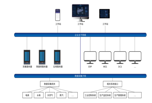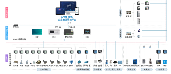 为了帮助企业进行三级能源计量体系的建设,找出低能效的源头,首先需要勘察、统计和明确企业的行业特性、生产架构、能源流向、主要设备、关键工序等,并且将附属的办公、食堂、宿舍等纳入监测体系,以下是一个工业企业典型的软硬件架构拓扑图。