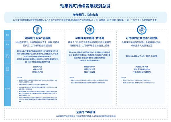 以具体行动践行企业社会责任 实现可持续发展承诺 随着新消费时代的到来,"健康、快乐、品质、环保、可持续"为核心的绿色消费理念正在深入人心,尤其是Z世代消费群体的崛起,更是引发了消费观念的改变,消费需求愈加呈现个性化、多元化趋势。Z世代消费新生代是成长国内经济高速发展时期的千禧一代,他们通过新的生活方式和消费观念彰显对国货品牌的认同,对社会发展的关注,对生态发展的可持续思考,由此也注重消费品牌对环保、可持续发展理念的传递和坚持。 珀莱雅作为中国化妆品领域的代表,在面临的生态环境和社会挑战愈演愈烈的情况下,也一直在思考应该在行业发展中以怎样的实际行动去平衡人与自然、人与社会的关系,从而实现资源分配的代际平衡,既满足当代人发展的需要,也不损害后代的生存利益。认识到自身对于实现全球的可持续发展义不容辞,珀莱雅以强有力的实际行动践行了这份企业社会责任。 此前,珀莱雅已经连续两年发布《可持续发展报告》和《环境、社会与公司治理报告》。2022年,结合自身实际情况,带着对社会可持续发展的承诺,珀莱雅发布了"可持续发展战略规划(2022-2025)"—"美美相生,共向未来",该发展规划兼顾自身发展与社会贡献,提出了"可持续的业务、可持续的价值链、可持续的社会生态"三大支柱,及对应的可持续发展目标,期待在自身可持续发展转型的带动下,与行业同道、合作伙伴以及消费者并肩同行,既能不断满足消费者求"美"的需求,又共同创造可持续发展的行业生态,实现可持续发展的长远目标。