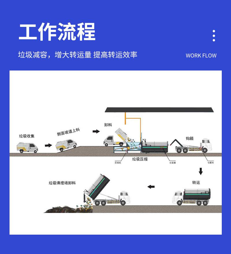 后翻式水平直压式垃圾压缩机设备主要由翻料斗、压缩机头、动力控制单元、箱体、锁紧机构、尾门组成。 后翻式水平直压式垃圾压缩机设备的作业流程 1、垃圾压缩装置与垃圾集装箱利用移箱机构对接后,将周边收集后的生活垃圾倒入料斗里面; 2、翻转料斗,把垃圾倒入压缩箱体内; 3、启动推压机构,对垃圾进行水平式压缩; 4、垃圾压满后,勾臂车和压缩箱体对接,把箱体和垃圾一起运往垃圾处理场,然后通过移箱平台将下一个空置的垃圾集装箱换上;上一个垃圾集装箱卸完垃圾后将空箱拉回垃圾转运站备用。