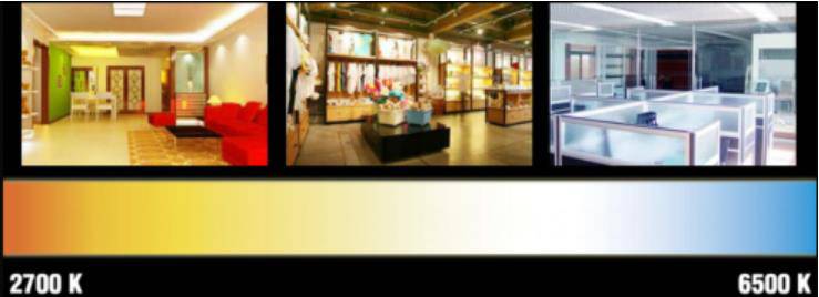 应用举例: 1、3300K以下-温度,舒适;适用于客厅、 卧室、旅店,并能使红色更鲜艳 2、3000K-6000K-自然光色愉快、舒适;适用于商店、医院、办公室、饭店、餐厅 3、5300K以上-明亮,使人精力集中;适用于办公室、会议室、教室、阅览室 |