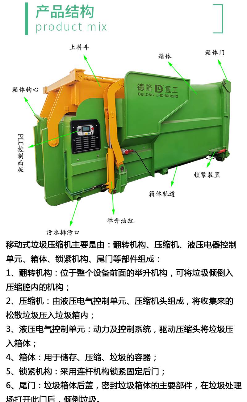 整体移动式垃圾压缩机是河南德隆出产的一款移动垃圾中转站配置设备,采用水平压缩工艺,日处理40-60吨,压缩密度在0.7t/m3(根据实际的生活垃圾压缩为准)。