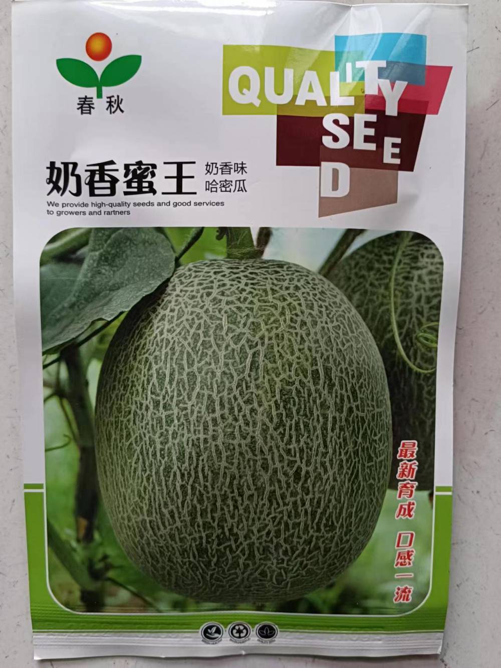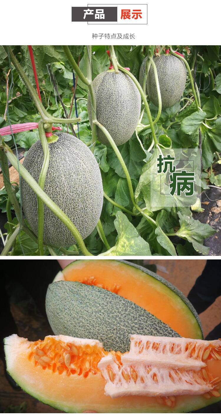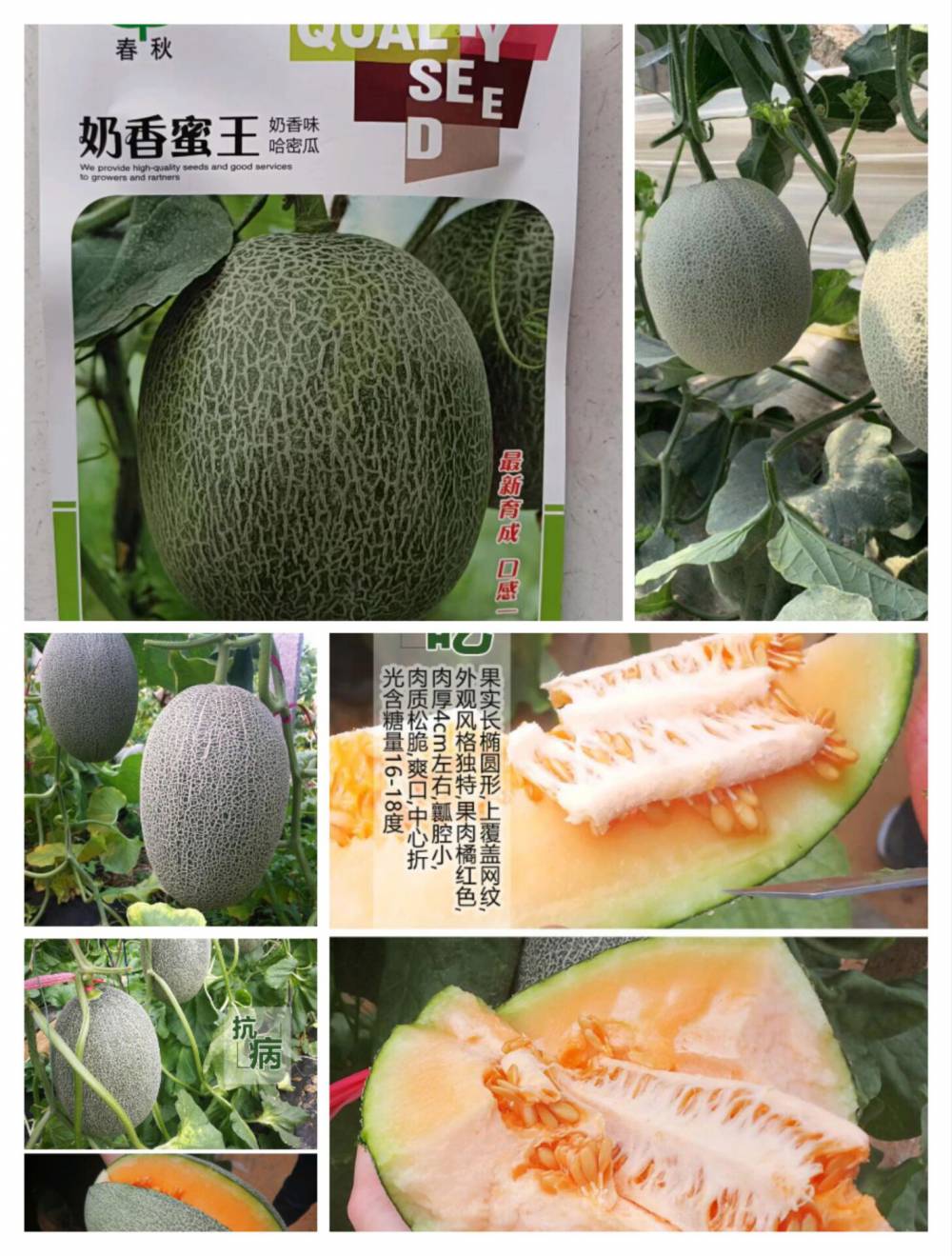 奶香蜜王种子 奶香味哈密瓜每袋200粒 品种主要性状: 中早熟哈密瓜品种,植株长势健壮,雌花开放至果实成熟45天左右。果实短椭圆形,果皮浅麻绿底,成熟后网纹密布全瓜,果肉橘红,肉质细;否感能风味好伴有奶香味,中心含糖量达18度左右,单果重2公斤左右,内厚腔细,耐贮运抗病能力突出,适宜早春、秋延种植,深受客户喜爱。