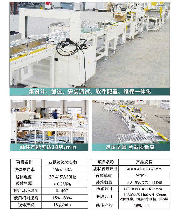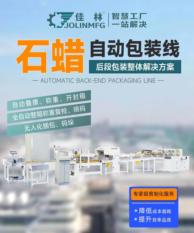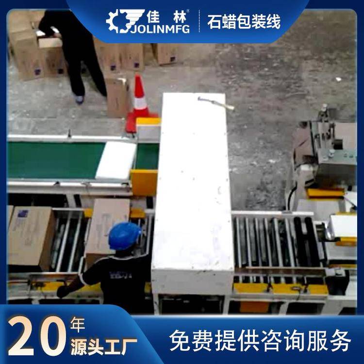 佳林 全自动包装线 开箱装箱封箱捆包 工厂定制 全自动包装线,称重包装码垛线,大连佳林设备制造有限公司致力于全自动供袋机、称重包装机及机器人码垛生产线设备的设计与制造.精心打造用于粉料、颗粒料、片料及混合料的全自动称重包装码垛机组。 石蜡全自动包装线:蜡块通过斜坡输送机传送到叠摞皮带机整列--通过过滤皮带机传送到转向链板机--当进入横向移载链板机后将蜡块推入热封切机内准备套膜封切收缩--蜡包暂存--纸箱自动开箱--蜡包自动定位--侧推式自动装箱机--侧边式折盖封箱机--捆包--外箱喷码--码垛区暂存输送--自动码垛--在线裹膜等一系列包装工艺流程。 品牌:佳林 加工定制:定制化软硬件 线体总功率:15kw50A 产品尺寸:L480xW300xH45mm(可定制) 线体电源:3P-415V/50Hz 石蜡单重:5kg/块(可定制) 线体气源:≥0.5MPa 装箱数量:5块排列方式:1列5层(可定制) 使用环境温度:0~40C 纸箱尺寸:L490xW310xH235mm(可定制) 可售卖地:北京;天津;河北;山西;内蒙古;辽宁;吉林;黑龙江;上海;江苏;浙江;安徽;福建;江西;山东;河南;湖北;湖南;广东;广西;海南;重庆;四川;贵州;云南;西藏;陕西;甘肃;青海;宁夏;新疆 型号:全自动包装生产线