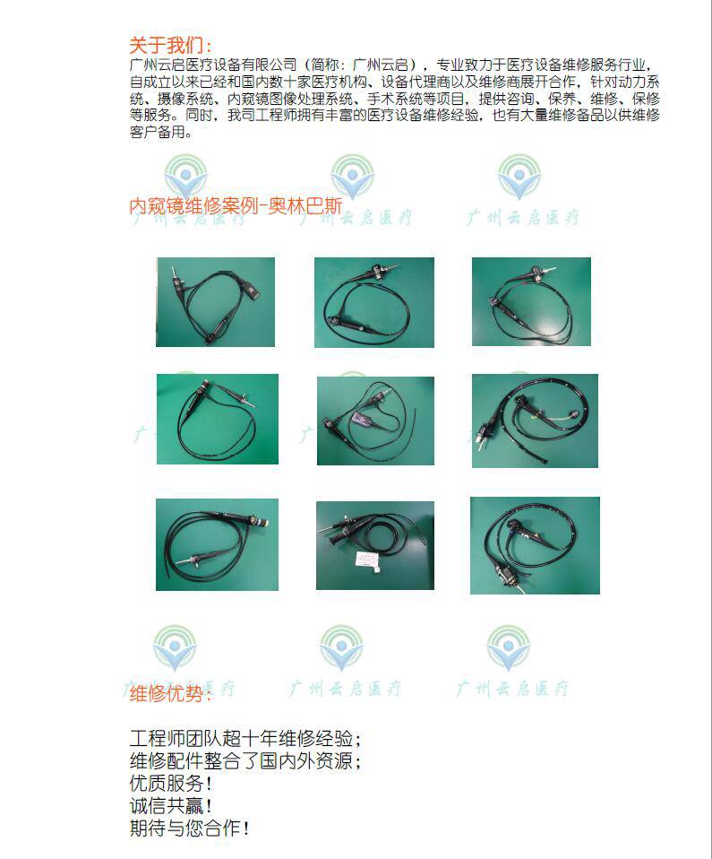 " 胆道镜维修更换 广州云启医疗设备有限公司成立于2016年,为广大医疗机构、设备代理商以及维修商服务。我们走向规模化、专业化的道路上给广大客户提供公平、高品质的服务。现有培训过的专业工程师。工程师都有10余年技术维修经验。设备齐全,拥有专业接待室,不同种类医疗设备的维修室。企业管理制度完善,实行设备进出制度,客户回访制度,能优质进行各类设备的维修服务。公司致力满足尊贵的客户日益增长的需求!不走捷径的企业核心价值观和为客户创造价值,赢取尊重和回报的职业理念,谒诚为广大客户提供贴心服务。