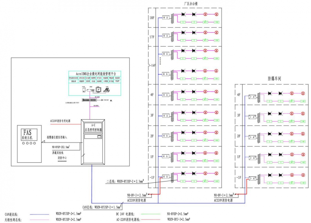图1 集中电源集中控制型系统 四大型商业建筑中应急照明系统设计的应用实例 1实例概况 一栋商业建筑有四层,包括一层地下室,总建筑面积约1.5万米,单层面积约3000米。疏散通道、安全出口、营业厅应设置疏散照明系统,引导施工人员通过应急疏散照明系统的照明和指示功能快速疏散。应急照明系统的控制器安装在一层消防控制室内,与火灾报警主机之间具有通信功能。并在楼梯入口处安装具有语音提示功能和频闪的安全出口灯,同时在疏散通道内安装具有可调功能的疏散指示灯。此外,地板主干道上还增加了地面光流指示灯。这些灯具可以改变方向,并具有闪光功能。正常情况下不开启,火灾发生时可为疏散人员提供指示。一旦二楼走廊发生火灾,应急照明系统的主机可以在消防联动的基础上收到火灾信息。检测系统运行后,应急照明系统调整到应急状态,发挥应急照明和疏散指示功能。 2应急照明系统的工作过程 (1)应急照明系统安装要求 安装在大型商业建筑中的双头应急灯和疏散指示灯均设置在建筑疏散楼梯间、消防电梯前室、疏散通道和营业厅。疏散指示灯安装在离墙0.5m处,应急灯与地面之间的距离约为2.2m,每20m安装一个。在商业营业厅,应根据交通流线设置1WLED地面疏散指示灯,每个安全出口应连续安装出口指示灯。疏散通道处应急照明要求高于1.0lx营业厅楼梯间的*低照明要求分别为3.0lx和5.0x。 五安科瑞消防应急照明及疏散指示系统选型方案 1系统概述 消防应急照明和疏散指示系统主要由应急照明控制器、消防应急照明集中电源或应急照明配电箱、消防应急灯等组成。该系统由安科瑞完全独立开发,符合国家现行行业规范,可满足与Acrelems企业微电网管理云平台或火灾自动报警系统的数据交换和共享。 当系统与火灾报警控制器配合使用时,通常对系统中的设备进行实时监控,方便日常管理和维护,确保系统的稳定运行。基于此,确保火灾发生时,能准确改变消防应急标志灯的指示方向,点亮消防应急灯,帮助建筑人员选择逃生疏散路线,指导安全逃生方向,确保人身安全,解决各类用户担心的安全问题。 2应用场所 适用于住宅、酒店、办公楼、商场综合体、医院、隧道管廊、轨道交通、地下室、仓库、工厂等行业的消防应急照明和疏散指示系统。 3系统结构