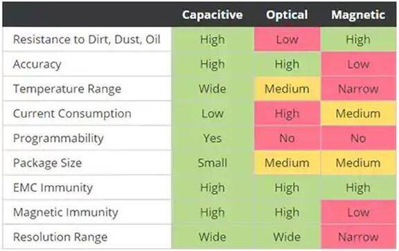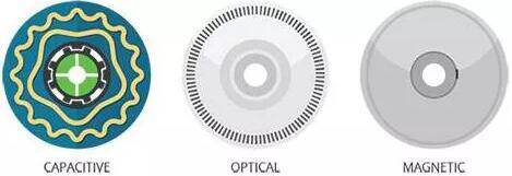 编码器码盘的比较 CAPACITIVE电容式编码器的优点•电容式编码器的工作原理与数字游标卡尺相同,因此它所提供的解决方案克服了光学OPTICAL和磁性编码器MAGNETIC的许多缺点。此外,相比光学编码器使用的玻璃码盘,它更不容易受到振动和极高/极低温度的影响。如前所述,因为电容式编码器不存在LED烧坏的情况,所以使用寿命往往比光学编码器长。因此,电容式编码器的封装尺寸更小,在整个分辨率范围内电流消耗更小,只有6至18mA,这就使它更适合电池供电应用。•鉴于电容式技术的稳健性、精度和分辨率均比磁性编码器高,因而后者所面临的电磁干扰和电气噪声对它的影响并不大。此外,在灵活性和可编程性方面,电容式编码器的数字特性也能带来关键优势。因为光学或磁性编码器的分辨率是由编码器码盘决定,所以需要其他分辨率时,每次都要使用新的编码器,以致于设计和制造过程的时间和成本均会有所增加。•然而,电容式编码器具有一系列可编程的分辨率,为设计人员免去了每次需要新的分辨率时就要更换编码器的麻烦,这不仅减少了库存,而且简化了PID控制回路的微调和系统优化。涉及BLDC电机换向时,电容式编码器允许数字对准和索引脉冲设置,而这项任务对于光学编码器而言可能既反复、又耗时。内置的诊断功能使设计人员可以进一步访问系统数据,用以优化系统或现场排除故障。