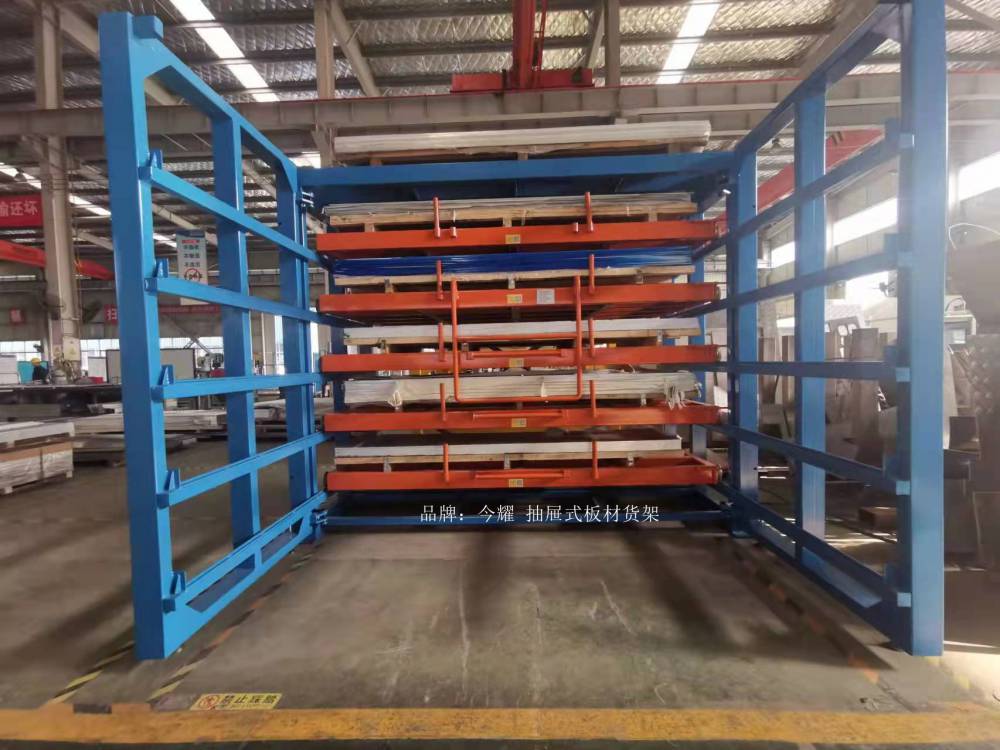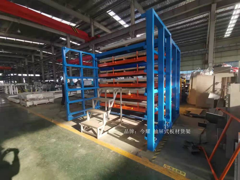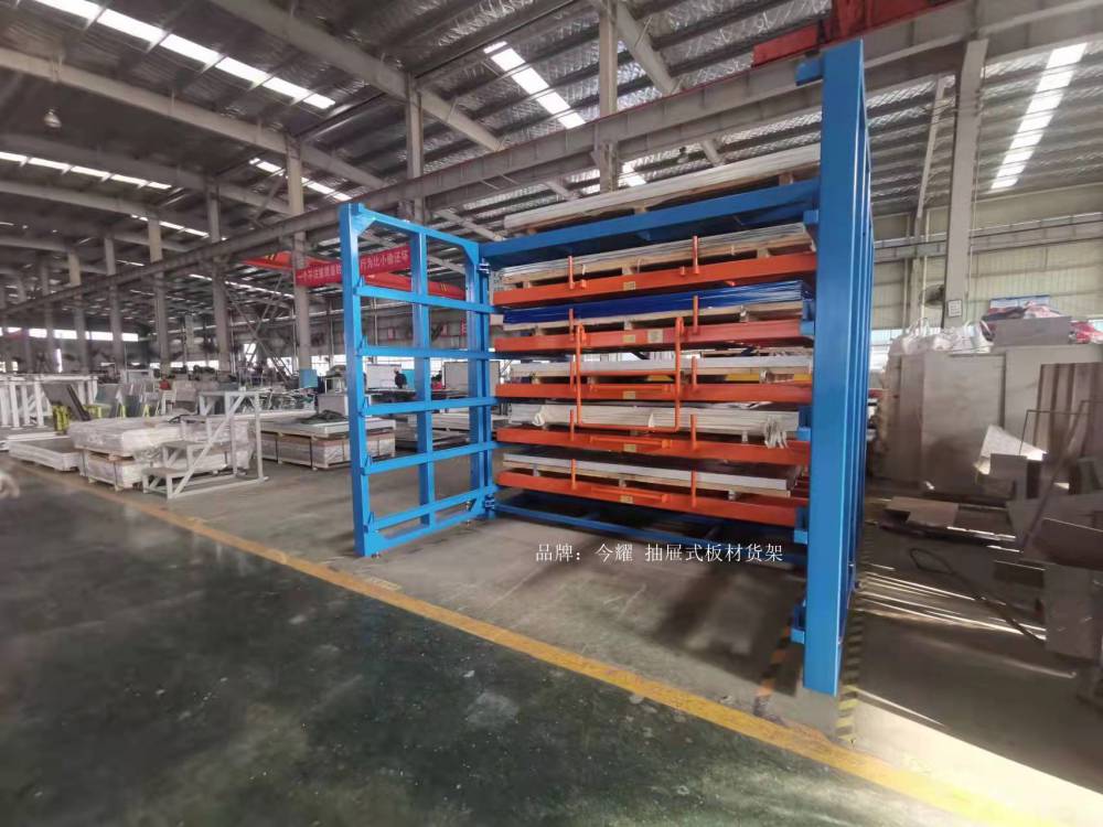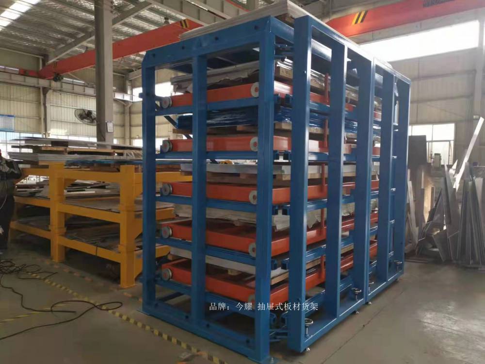 9月5日 天津一企业车间里,工人操作使用抽屉式板材货架 货架存放长度2.5*1.25的板材,一般整托存放,设计为5+1层,单层承重3吨,主要是叉车进行整托板材上架,取用时利用吸盘单张取放到切割机上 操作过程轻松安全快捷