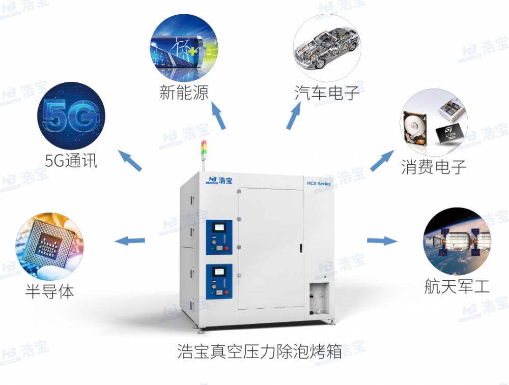 真空压力除泡烤箱常用于半导体、航天***、MiniLED、新能源、汽车电子、消费电子、5G通讯等领域的芯片黏结(DAF)、屏幕贴合(OCA)、底部填充胶(Underfill)、灌封胶(Potting)或印刷涂覆胶(Printing)等工艺制程中,因为在产品的贴合面、胶水或银浆中难以避免地会产生气泡或空洞,这些气泡不仅影响产品的外观,更主要会导致产品密封性差、散热性差、热阻高,严重影响产品性能、可靠性或一致性,降低产品良率,甚至造成质量事故,出现安全隐患。而解决这个问题的方法就是采用真空压力除泡烤箱来消除空洞或气泡。