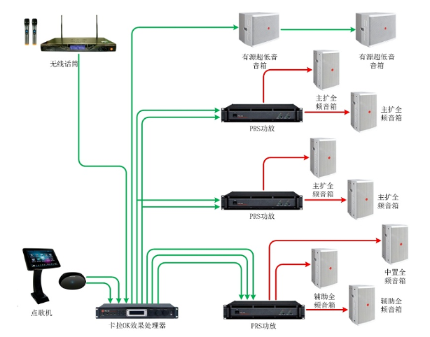 KTV扩声系统,采用语言和音乐兼用扩声一级标准为设计目的, 采用 “集中为主,分散补声”。设备要“系统集成”,即是将音响、视频、舞台灯光和集中控制等不同功能的子系统在物理上逻辑上和功能上连接在一起,以实现信息综合、资源共享,达到满足KTV各项功能和指标的要求。