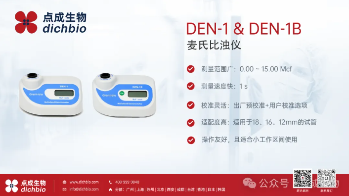 导读 在药品生产、微生物检验、食品安全监控等领域,微生物浓度的精准控制是保障产品质量与安全的核心环节。无论是疫苗效价测定、***敏感性试验,还是食品中微生物限度检测,都离不开对细菌或酵母悬液浊度(McFarland单位)的快速、准确测定。 比浊仪正是为此而生的——它通过测量细胞悬液对光的散射程度,非接触式快速评估微生物浓度,为标准化操作和可靠结果提供坚实保障。 点成Grant比浊仪的工作原理 点成Grant比浊仪采用国际通用McFarland标准:在特定波长下,规则分散的微生物悬液,其浊度与细胞浓度呈线性正相关。 精密光学系统捕获样品90°方向的散射光信号,并即时转换为直观的McF数值,实现浓度的数字化、可追溯测量。 两款核心型号,满足不同场景 1️⃣ DEN-1 基础款 性能稳定,接电即可使用 2️⃣ DEN-1B 升级款 双供电模式:支持电池或电源线供电 智能待机:空闲1分钟自动熄屏,按“On”键瞬时唤醒 加样要求 平底管:液面高于管底 ≥7mm 圆底管:液面高于管底 ≥12mm(16mm管约需≥2ml) 加样不足会导致测量失败或精度下降 测量范围 标称范围:0.00–15.00 McF 推荐范围:0.0–6.0 McF(约 0–1.8×10^9 cells/ml) 在高浓度端,误差可能***增加 总结 点成Grant DEN-1和DEN-1B比浊仪,凭借其精准的麦氏浊度测量能力、超快的检测速度、用户友好的操作体验、灵活的样品管兼容性以及***竞争力的进口品牌性价比,成为药品微生物检验、临床诊断、食品安全监控及基础研究中不可或缺的工具。结合点成生物提供的专业、快速的技术支持服务,点成Grant比浊仪为各类实验室在追求高效、准确、合规的质量控制道路上,提供了值得信赖的解决方案。