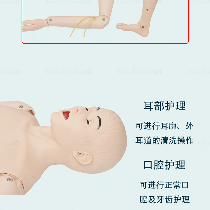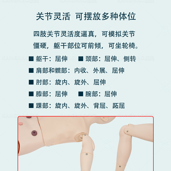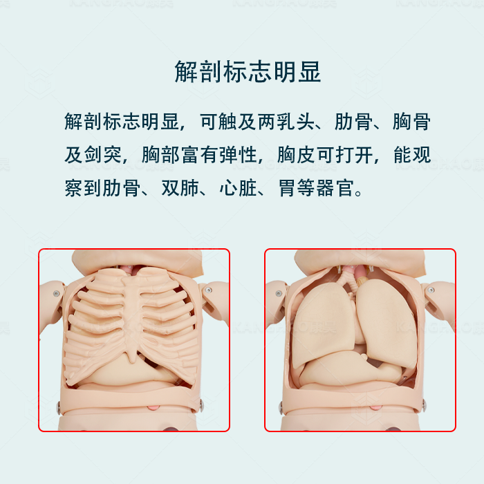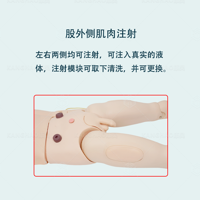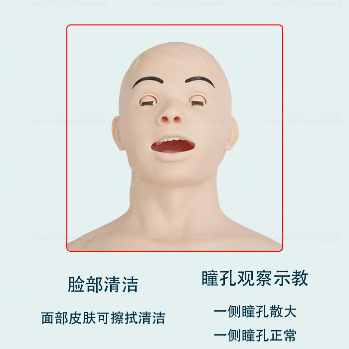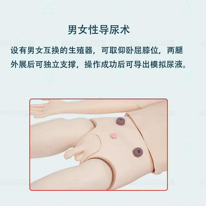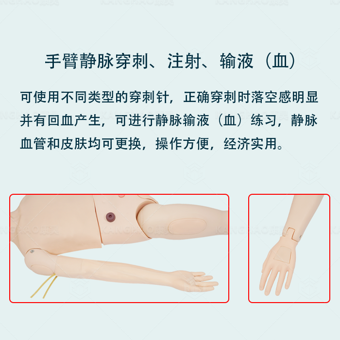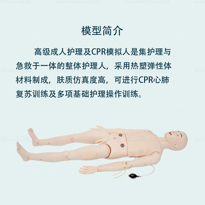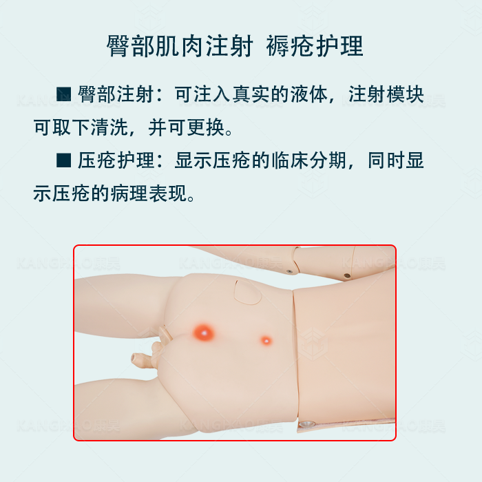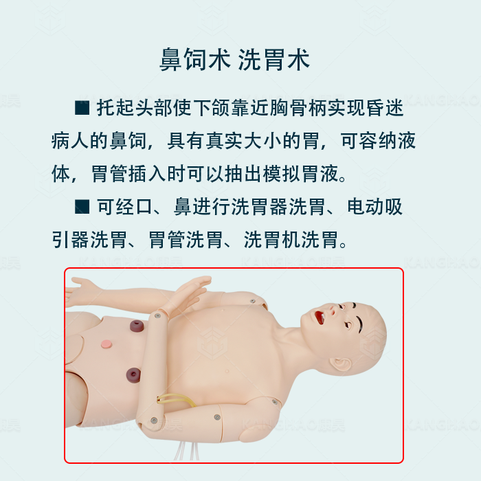 KH-3000***成人护理及CPR模拟人是集护理与急救于一体的整体护理人,高分子环保材料制成,肤质仿真度高,可进行CPR心肺复苏训练及多项基础护理操作训练。 一、功能特点: 1.KH-3000解剖标志明显,可触及两乳头、肋骨、胸骨及剑突,胸部富有弹性,胸皮可打开,能观察到真实大小的肋骨、双肺、心脏、肝脏、胃等器官。 2.四肢关节灵活度逼真,可模拟关节僵硬,躯干部可前倾,可坐轮椅。 A.躯干:屈伸 B.颈部:屈伸、侧转 C.肩部和髋部:内收、外展、屈伸 D.肘部:旋内、旋外、屈伸 E.膝部:屈伸 F.腕部:屈伸 G.踝部:旋内、旋外、背屈、跖屈 3.可实现多种体位:去枕平卧位、屈膝仰卧位、半坐卧位、端坐位、俯卧位、头低足高位、头高足低位、侧卧位、截石位、昏迷体位等,满足操作需要。 4.可进行床上擦浴、更衣、病人搬运,翻身、手足护理,扶助病人移向床头法、轮椅使用法、平车运送法、担架运送法等移动和搬运病人法,轴线翻身法、肢体约束法、肩部约束法、全身约束法等基本护理操作。 5.脸部清洁:面部皮肤可擦拭清洁。 6.瞳孔观察示教:一侧瞳孔散大、一侧瞳孔正常。 7.耳部护理:可进行耳廓、外耳道的清洗。 8.口腔护理:可进行正常口腔及牙齿护理。 9.心肺复苏术操作训练,人工口对口呼吸(吹气)时: A.动态条码指示灯显示潮气量大小:吹入的潮气量正确由条码绿灯显示,吹入的潮气量过小由条码黄灯显示,吹入的潮气量过大由条码红色指示灯动态反馈显示潮气量大小。 B.电子计数显示:详细记录吹气正确和错误的次数(吹气量过大、吹气力量过小)。 C.语音提示:中文语音提示,详细提示吹气错误的具体原因(吹气量过大、吹气力量过小)以便训练者及时改正。 10.心肺复苏术操作训练,人工手位胸外按压时: 11.动态条码指示灯显示按压深度:按压深度正确由条码绿灯显示,按压深度过小由条码黄灯显示,按压深度过大由条码红色指示灯动态反馈显示按压深度。 12.电子计数显示:详细记录按压正确和错误的次数(按压力量过大、按压力量过小)及按压频率(过快、过慢、正确)的次数等。 13.语音提示:中文语音提示,详细提示按压错误的具体原因(按压力量过大、按压力量过小、按压频率过快、按压频率过慢),以便训练者及时改正。 14.依据《2015年美国心脏协会心肺复苏及心血管急救指南》的操作标准,对心肺复苏操作进行评价,操作达标,模拟人复活,操作未达标,模拟人死亡。 15.操作模式:训练、考核、实战三种操作模式,每种模式均可自行设置操作时间,考核和实战模式可设置CPR循环次数。 16.按压与人工呼吸比:30:2(单人或双人)。 17.操作周期:先30次按压再2次人工吹气,30:2五个循环周期CPR操作或自行设定CPR循环次数。 18.操作频率:100-120次/分。 19.操作时间设置:30秒-30分钟。 20.操作时间:以秒为单位计时。 21.成绩打印功能:操作结束后可打印成绩单。 22.成绩评定包含:合格、不合格。 23.电源状态:采用220V电源,经过稳定器稳压后输出电源12V(可选加装锂电池,适用于无外接电源的情况下直接使用)。 24.挤压气囊可触及颈动脉搏动。 25.可进行气管切开术后护理。 26.可进行吸痰术练习。 27.氧气吸入法:鼻孔内可插入吸氧管,练习氧气吸入的操作过程。 28.雾化吸入疗法:可练习雾化吸入的操作过程。 29.鼻饲术:托起头部使下颌靠近胸骨柄实现昏迷病人的鼻饲,具有真实大小的胃,可容纳250ml的液体,胃管插入45-55cm时,可以抽出模拟胃液。 30.洗胃术:可经口、鼻进行洗胃器洗胃、电动吸引器洗胃、胃管洗胃、洗胃机洗胃,胃容量约为200ml。 31.手臂静脉穿刺、注射、输液(血):可使用不同类型的穿刺针,正确穿刺时落空感明显并有回血产生,可进行静脉输液(血)练习,静脉血管和皮肤均可更换,操作方便,经济实用。 32.上臂三角肌皮下注射:可注入真实液体,注射模块可取下清洗,并可更换。 33.臀部肌肉注射:可注入真实液体,注射模块可取下清洗,并可更换。 34.股外侧肌肉注射:可注入真实液体,注射模块可取下清洗,并可更换。 35.男性导尿术:可取仰卧屈膝位,两腿外展后可独立支撑,男性阴茎可提起与腹壁成60度角,插管时可真实感受男性尿道的三个狭窄、两个弯曲,操作成功后可导出模拟尿液。 36.女性导尿术:可取仰卧屈膝位,两腿外展后可独立支撑,女性尿道充分体现短、粗、直,具有尿道口、阴道口、阴蒂等解剖结构,操作成功后可导出模拟尿液。 37.留置尿管和膀胱冲洗术。 38.造瘘口护理:腹壁有回肠造瘘口和结肠造瘘口,内连集液瓶,可进行造瘘口护理。 39.灌肠操作训练:可实现大量不保留灌肠、小量不保留灌肠、清洁灌肠和保留灌肠等多种灌肠方式。 40.压疮护理:显示压疮的临床分期4个不同阶段,同时显示压疮和各种病理表现:压疮炎症、溃疡、窦道、腐肉、坏死、焦痂等,可进行伤口的评估、测量与清洗。 A.***期:淤血红润期。 B.***期:炎症浸润期。 C.第三期:浅度溃疡期。 D.第四期:坏死溃疡期。 41.可练习手指、足趾的包扎。 42.其他护理操作:冷热疗法护理、外阴擦洗、外阴湿热敷、尿道冲洗、床上擦浴、座式擦浴、穿换衣服等多项护理操作。 二、标准配置: 1.***成人护理及CPR模拟人:1台 2.电脑数码显示器:1台 3.复苏操作垫:1条 4.呼吸面膜(50张/盒):1盒 5.热敏打印纸:2卷 6.现场急救常用技术使用手册:1本 7.电源适配器:1个 8.说明书:1册 9.保修卡合格证:1张
