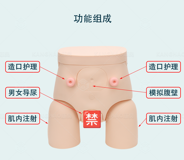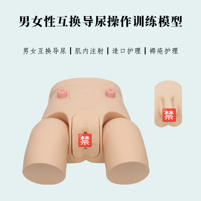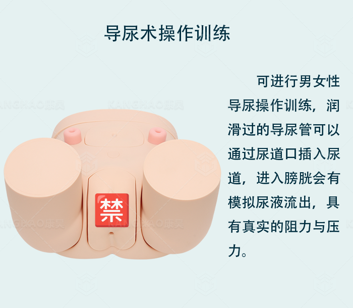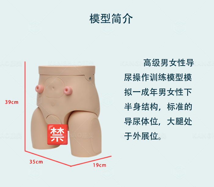一、功能特点: 1.KH-D34***男女性导尿操作训练模型模拟一成年男性下半身结构,标准的导尿体位,大腿处于外展位。 2.模型参照男女性内外生殖器解剖结构设计,采用高分子材料制成,仿真度高,外阴部形象逼真、手感真实。 3.可进行男女性互换导尿操作训练,润滑过的导尿管可以通过尿道口插入尿道,进入膀胱会有模拟尿液流出,具有真实的阻力与压力。 4.腹壁可打开,能观察到内部模拟膀胱及模拟肠道结构。 5.可进行造瘘口护理训练。 6.可进行灌肠术训练。 7.可进行臀部肌肉注射训练。 8.可进行股外侧肌肉注射训练。 9.可进行褥疮护理训练。 10.可进行腰部注射训练。 11.可反复进行练习。 12.模型尺寸:39×35×19cm。 二、标准配置: 1.男性导尿操作训练模型:1台 2.可更换女性生殖器:1个 3.导尿管:1根 4.肛门管:1根 5.注射器:1支
