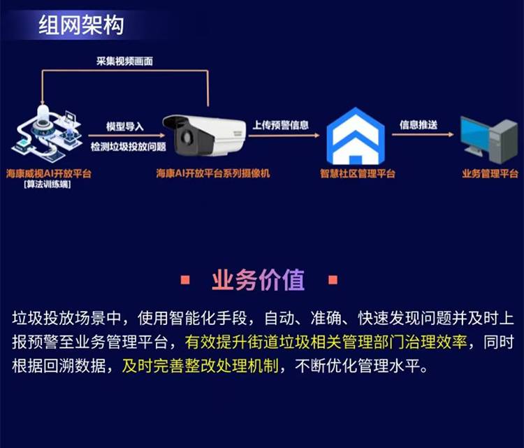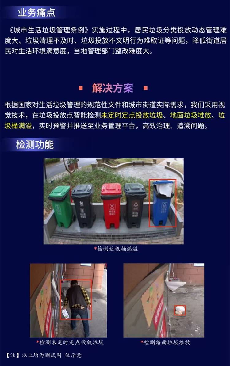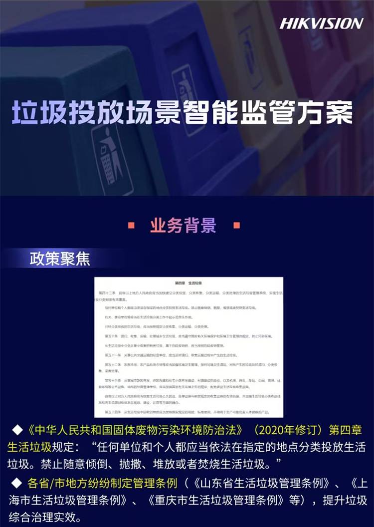 垃圾投放场景智能监管方案 业务背景 政策聚焦 福西摩,生洪给 有门十二条,日强以上城万人化告资商商汇进口分委控技,分委、分委法验、分学计理的法时输管资系椅、宝国生分尖制重有站增盖。 任州单公松个人都合海优通在理区的电众绿实批技理法对备,从业场备批会,联察,据技成省共统主油垃报。 机天、事血攀位等通海点生达路报分关工作中路子总华头作限 D经分类险西的理通协册,商西限阳院市分支表业、分源 限五十集、结门、电业、医镇、针编城务生运政装,建电通中国术白环通保护和环通下生管理的建,纳出网净环油。 队生环岭资小分类开趣中教警治有限设箱,子品时公动明,府西站区技宝资理。 限五十一、从事公其交通运输的9时营单位,座高从南局、受输饮程中广生的生达垃报。 陆五十二年:农营本场,农严品批发市场等症西部营际镇卫生管理,保际保确卫工通法,对产的垃联及时日,分免能、安典钟弹。 筑古十二条:从事城市部区开发,肥区改注划红字小区开发理设、村销进设的举份,及机通、货,车站、公,商通自场馆够公共况胎,场币的址营管继警份,应品控国国市有关林地卫生的规示,业建院生法垃销农型政族 品管计上维为人民品中安品焕管1站行份公队转器,央押区维与融散现车的省业设通警右钟4,经局银公长国黑中四男内性而推时,由,区费方不城 《中华人民共和国固体废物污染环境***法》(2020年修订)第四章生活垃圾规定:“任何单位和个人都应当依法在***的地点分类投放生活垃圾。禁止随意倾倒、抛撒、堆放或者焚烧生活垃圾。 ◆各省/市地方纷纷制定管理条例(《山东省生活垃圾管理条例》、《上海市生活垃圾管理条例》、《重庆市生活垃圾管理条例》等),提升垃圾综合治理实效。业务痛点 《城市生活垃圾管理条例》实施过程中,居民垃圾分类投放动态管理难度大、垃圾清理不及时、垃圾投放不文明行为难取证等问题,降低街道居民对生活环境满意度,当地管理部门整改难度大。 解决方案 根据国家对生活垃圾管理的规范性文件和城市街道实际需求,我们采用视觉技术,在垃圾投放点智能检测未定时***投放垃圾、地面垃圾堆放、垃圾桶满溢,实时预警并推送至业务管理平台,高效治理、追溯问题。组网架构 采集视频画面 模型导入 上传预警信息 信息推送 检测垃圾投放问题 海康威视AI开放平台 [算法训练端] 海康AI开放平台系列摄像机 智慧社区管理平台 业务管理平台 业务价值 垃圾投放场景中,使用智能化手段,自动、准确、快速发现问题并及时上报预警至业务管理平台,有效提升街道垃圾相关管理部门治理效率,同时根据回溯数据,及时完善整改处理机制,不断优化管理水平。核心产品“ 海康威视AI开放平台 海康AI开放平台系列 摄像机 智慧社区管理平台 微信扫码关注更多案例 4 海康威视为客用户提供持续的AI工程化专业支撑,基于海康威视AI开放平台快速定制场景算法,从算法实现到业务落地,满足各行业智能化转型需求,与客用户携手共赢,创造价值。